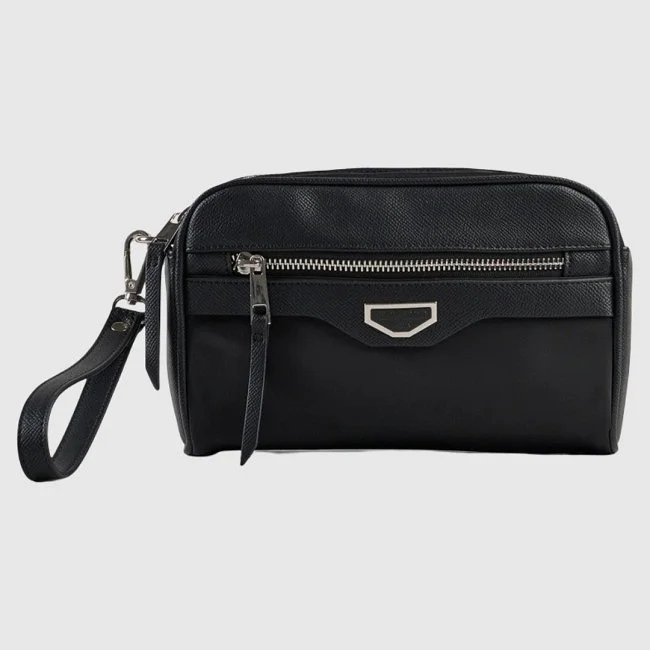 Bolso de mano Antony Morato de diseño estructurado y formato horizontal. Presenta compartimento principal con cierre de cremallera y bolsillo frontal adicional también con cremallera para una mejor organización. Incorpora placa metálica con logotipo en la parte delantera y asa lateral desmontable que facilita su transporte. Ideal para llevar tus objetos personales con estilo y practicidad.