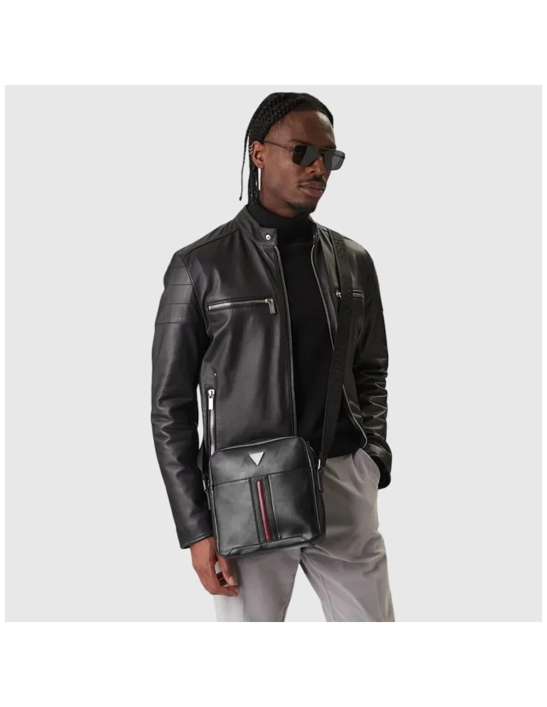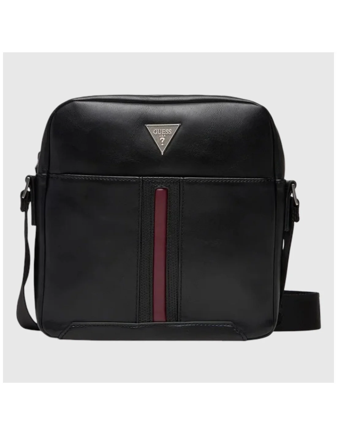 Bandolera Guess de diseño rectangular con correa ajustable al hombro. Incluye logotipo metálico en forma de triángulo al frente y detalle decorativo en contraste vertical. Ideal para un estilo urbano y funcional, fabricada en material sintético con acabado suave.
