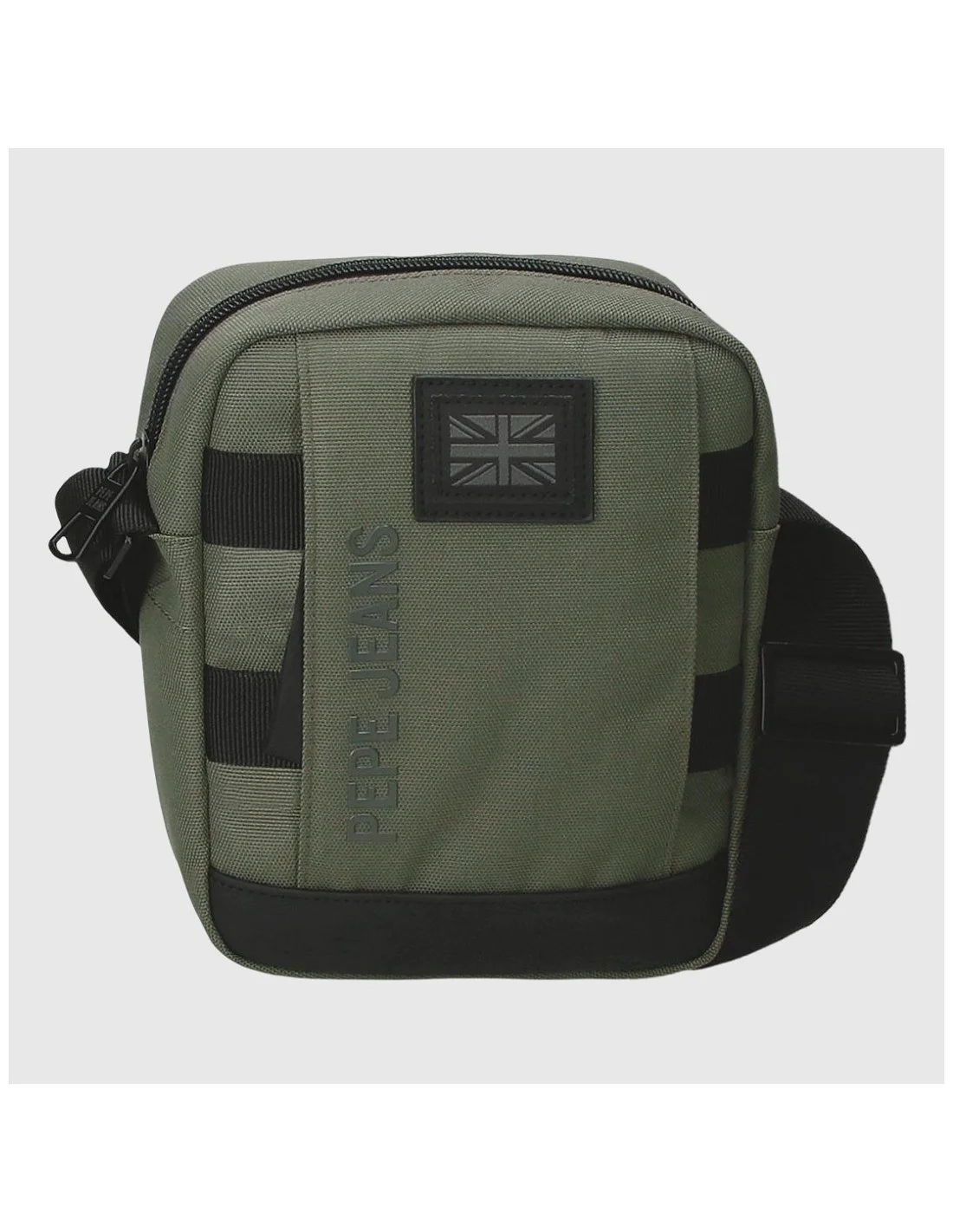Bandolera Pepe Jeans en verde oliva con diseño compacto, ideal para uso diario. Fabricada en poliéster resistente, cuenta con compartimento principal, bolsillo trasero con cremallera y detalles en negro como el logo vertical y la bandera. La correa ajustable permite llevarla con comodidad en cualquier situación.