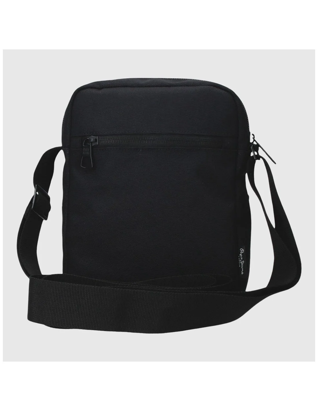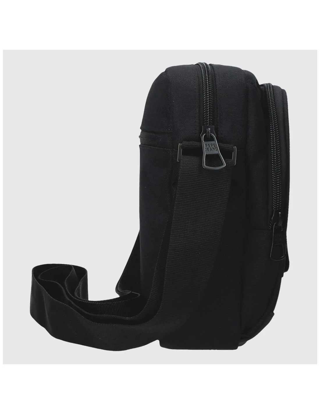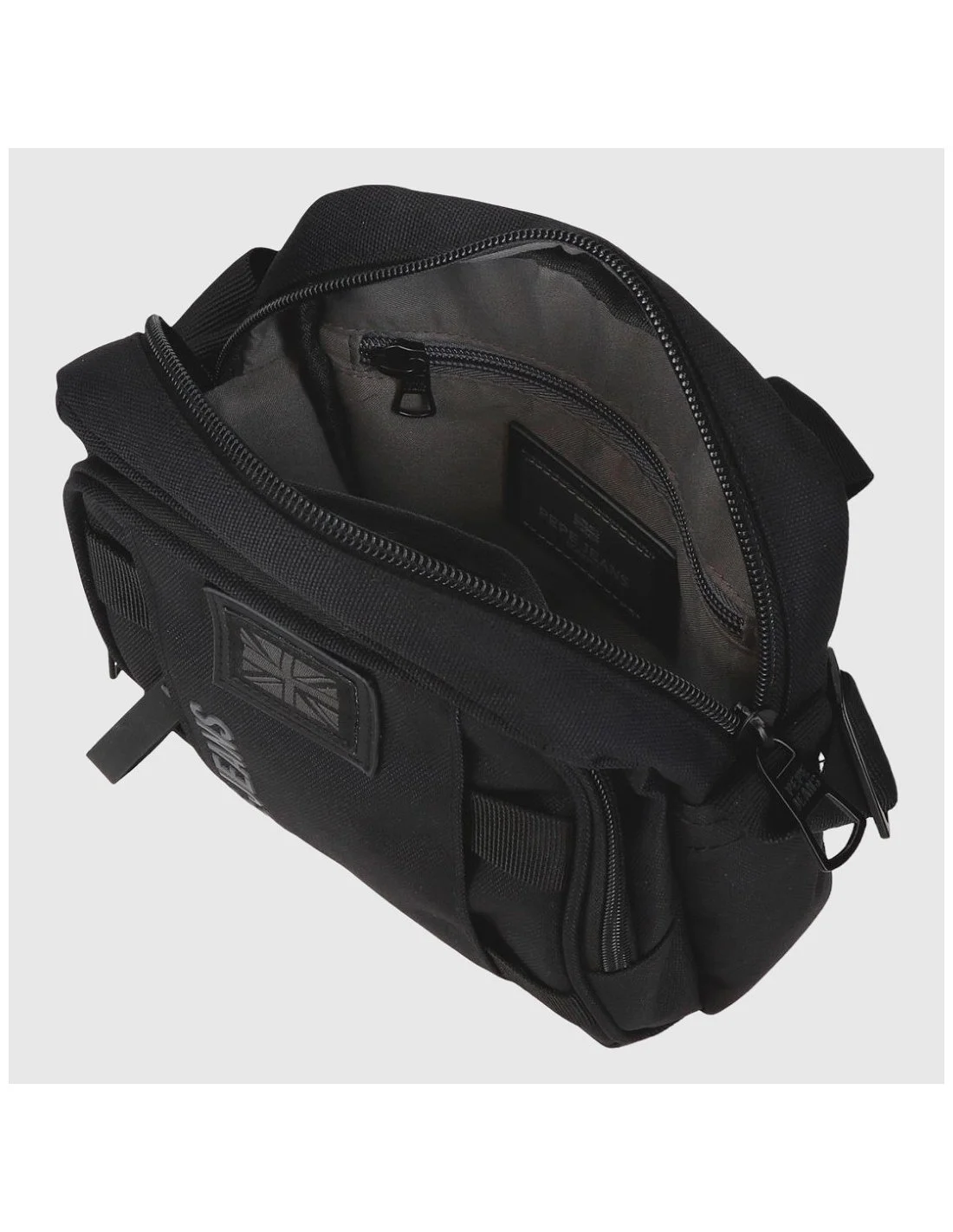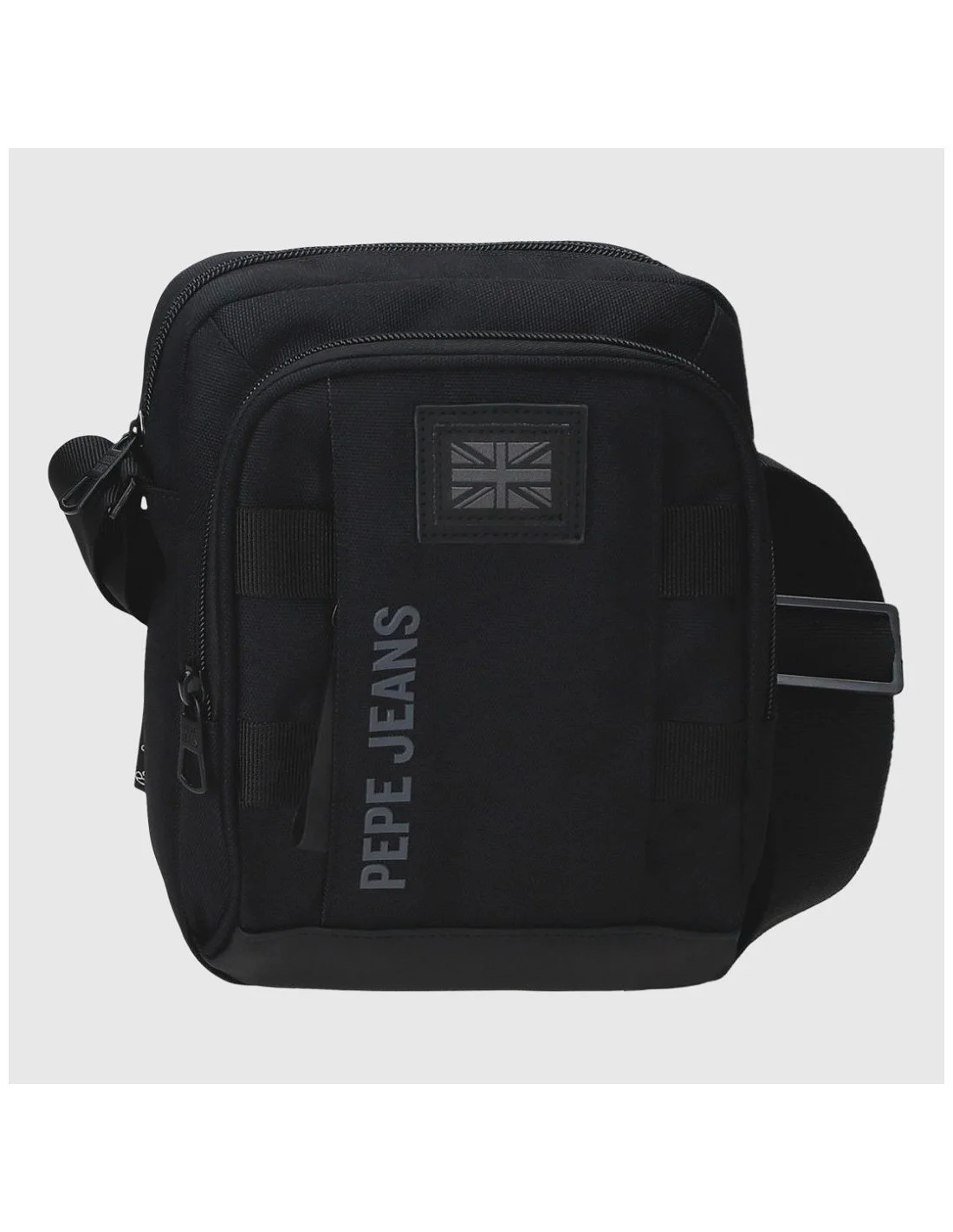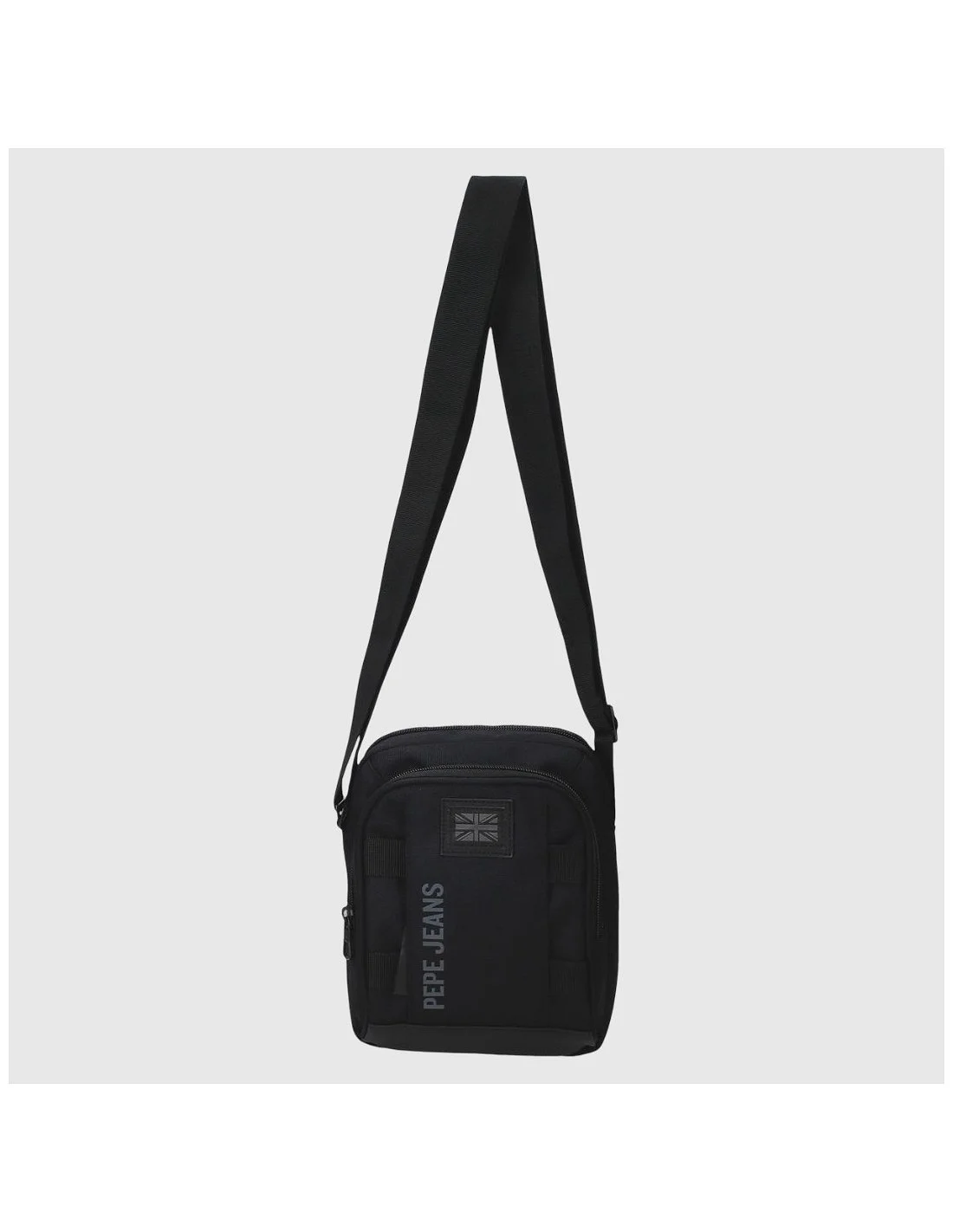 Bandolera Pepe Jeans en color negro, con diseño urbano y funcional. Fabricada en poliéster duradero, incorpora dos compartimentos con cremallera, bolsillo trasero, detalles decorativos frontales y correa ajustable. El logotipo vertical y el parche de la bandera británica refuerzan su estilo moderno y versátil.