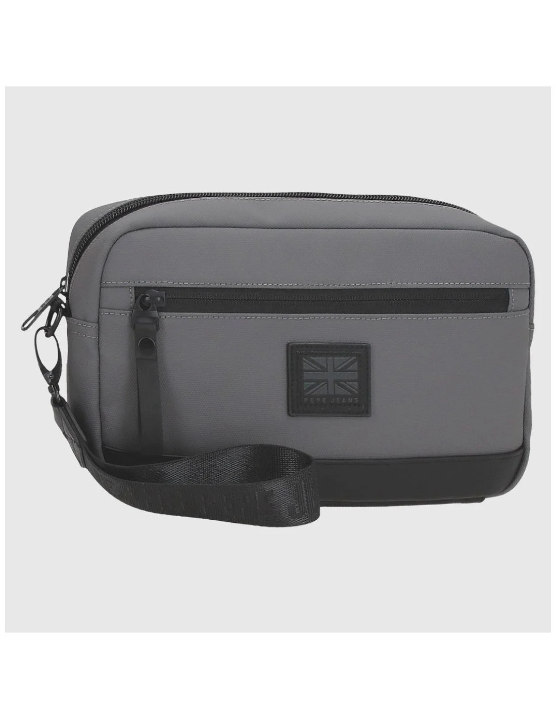 Neceser Pepe Jeans en color gris con detalles negros, fabricado en poliéster resistente. Cuenta con compartimento principal, bolsillo frontal y trasero con cremallera, y asa lateral desmontable con logotipo. El parche con la bandera británica refuerza su estilo moderno. Ideal para viajes o uso diario.