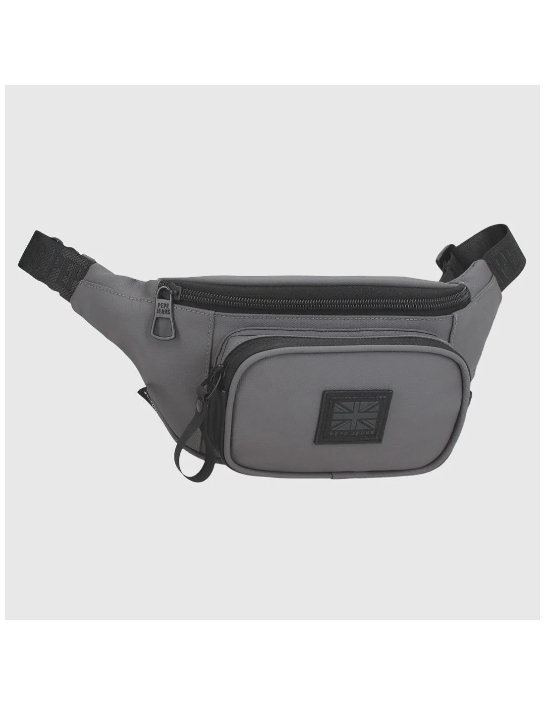 Riñonera Pepe Jeans gris con detalles en negro, diseño urbano y compacto. Incluye compartimento principal con cremallera, bolsillo frontal con logo en relieve, y bolsillo trasero para mayor seguridad. Cinta ajustable con branding en relieve, ideal para llevar al hombro o cruzada. Fabricada en poliéster resistente al uso diario.