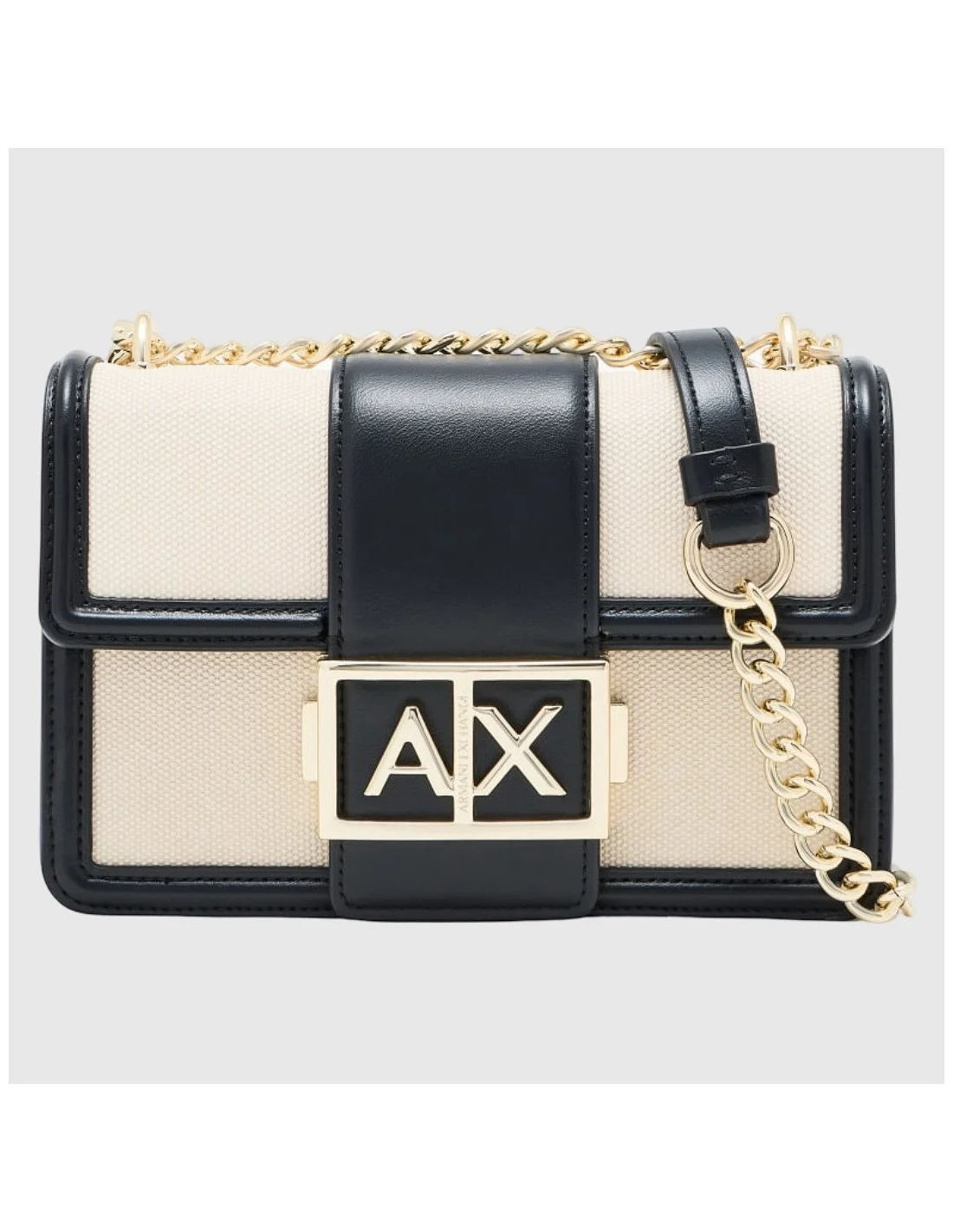 Bolso Armani Exchange de diseño estructurado y estilo sofisticado. Confeccionado con combinación de materiales y acabado texturizado, presenta solapa frontal con cierre magnético y distintivo logotipo metálico AX en gran formato. Incorpora asa de cadena con detalle de hombrera, permitiendo llevarlo al hombro o cruzado. El interior forrado cuenta con compartimentos prácticos para una mejor organización. Un accesorio elegante y versátil, ideal para completar looks tanto de día como de noche.