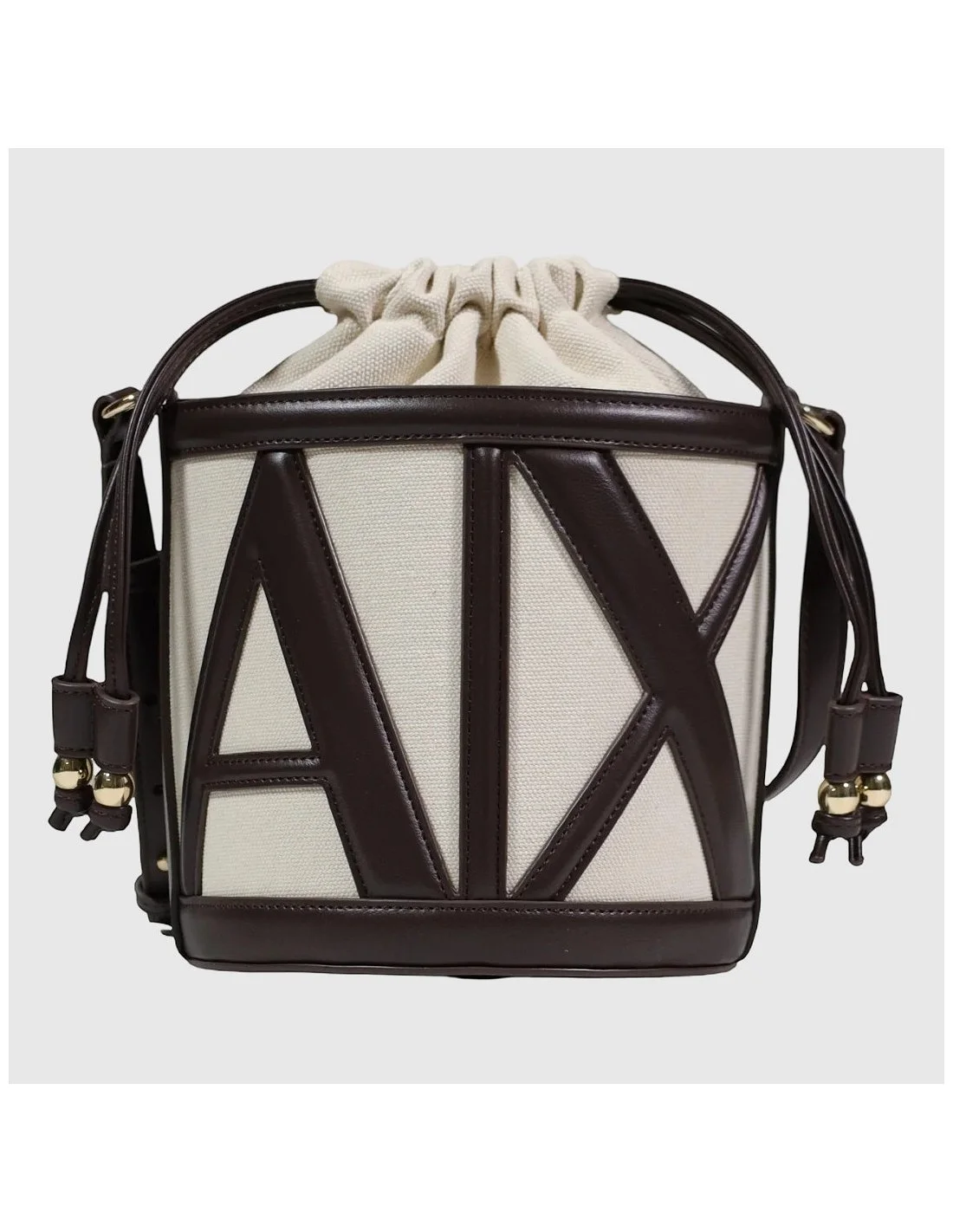 Bolso bucket Armani Exchange en formato compacto, confeccionado en tejido efecto lona con detalles en material sintético en contraste. Presenta cierre superior fruncido, asa superior estructurada y correa larga ajustable para llevar al hombro o cruzado. El logo A|X en relieve protagoniza el frontal, aportando un acabado distintivo y elegante. Un accesorio versátil, práctico y sofisticado para el día a día.