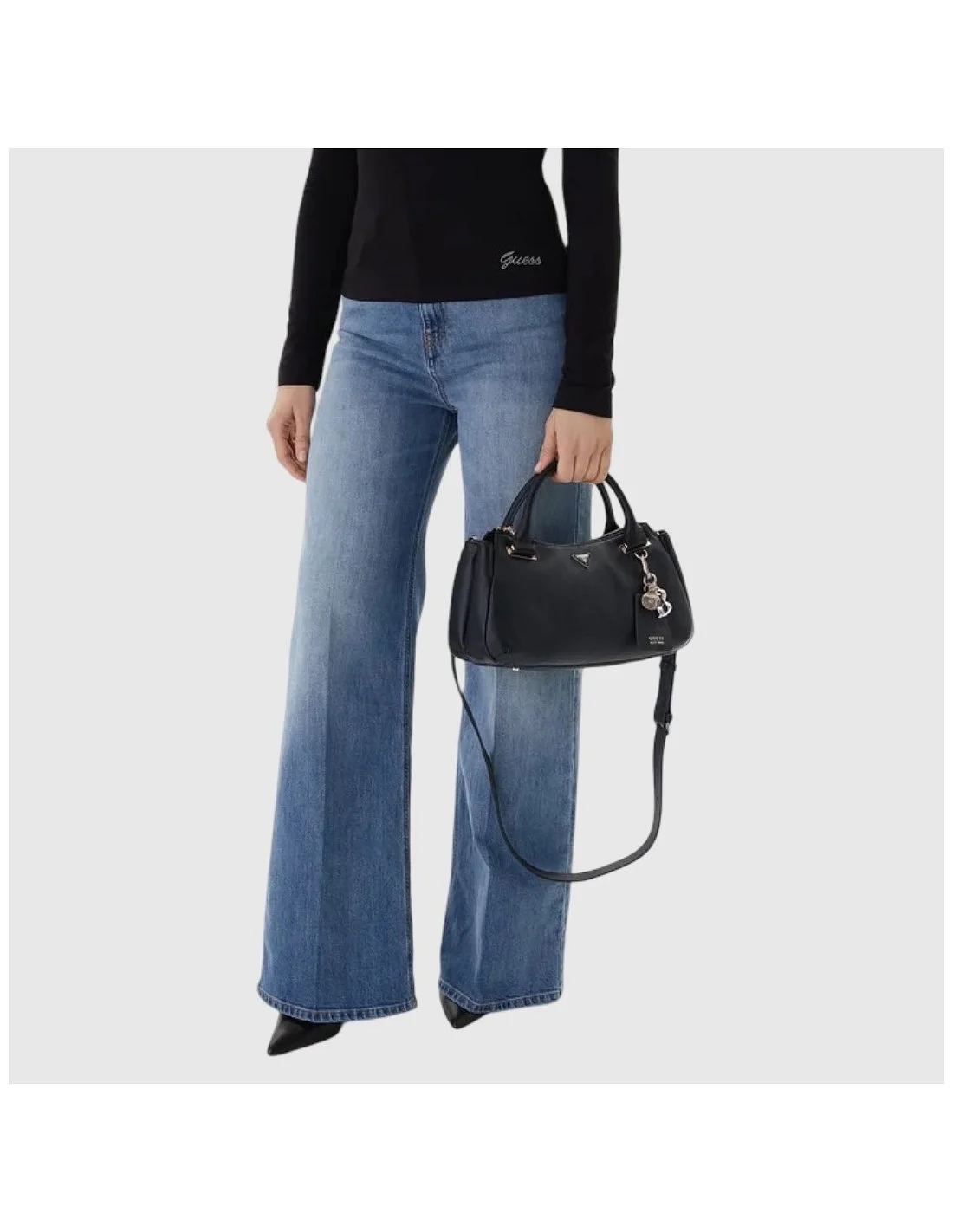 El bolso de mano Guess presenta un diseño estructurado y funcional con doble asa corta y correa ajustable para llevar al hombro o cruzado. Fabricado en material sintético con textura granulada, cuenta con cierre superior de cremallera, bolsillo exterior y charm decorativo con logotipo. Ideal para uso diario con un estilo sofisticado.