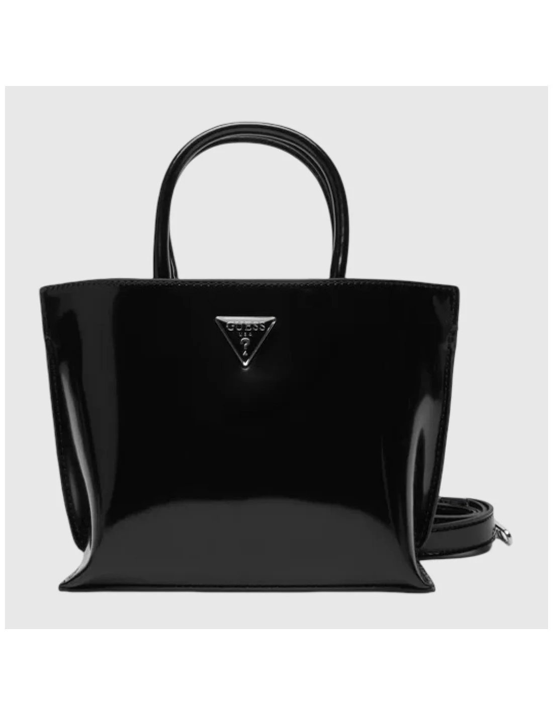 Bolso Guess con acabado brillante y logotipo metálico triangular al frente. Presenta doble asa corta y correa ajustable para llevar al hombro o cruzado. Su diseño estructurado y moderno lo convierte en una opción sofisticada para uso diario o eventos especiales. Fabricado en material sintético.