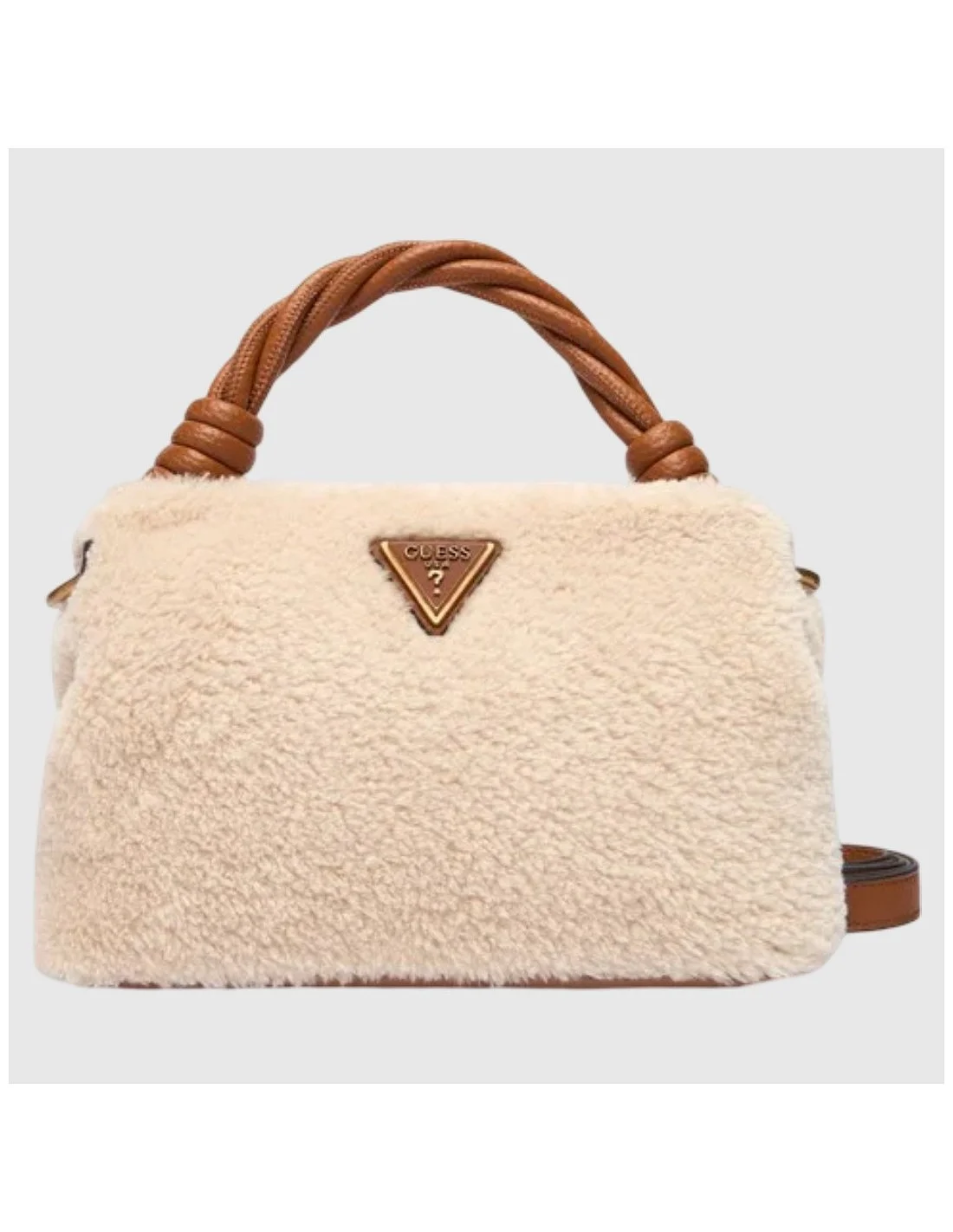 El bolso de GUESS destaca por su diseño invernal y acogedor, confeccionado en tejido tipo borreguito con detalles en piel sintética trenzada. Cuenta con asa superior, correa ajustable para llevar al hombro o cruzado y cierre magnético. El interior está forrado con compartimentos funcionales, y el logo triangular metálico en el frontal aporta el sello distintivo de la marca. Ideal para complementar looks casuales con estilo.