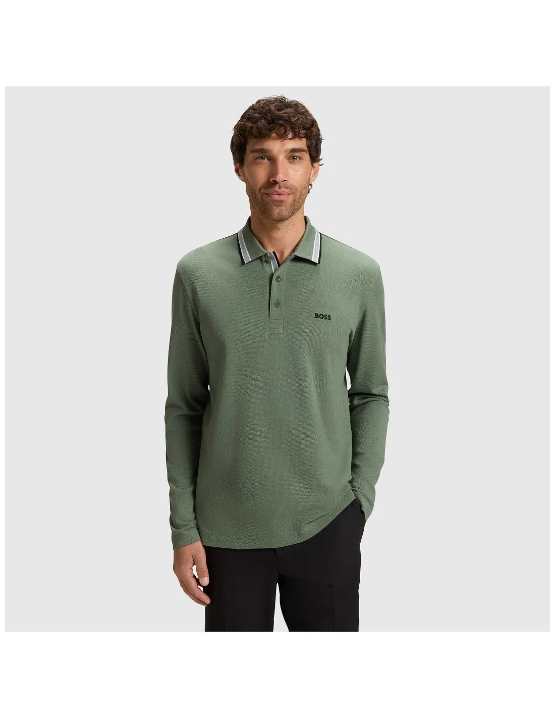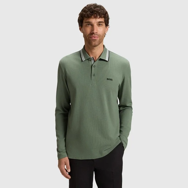 Polo BOSS para hombre de manga larga confeccionado en piqué de algodón premium. Presenta cuello clásico con detalle de líneas en contraste, tapeta de tres botones y logotipo bordado en el pecho. Una prenda versátil y elegante que combina comodidad con un estilo sofisticado.