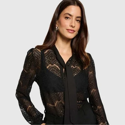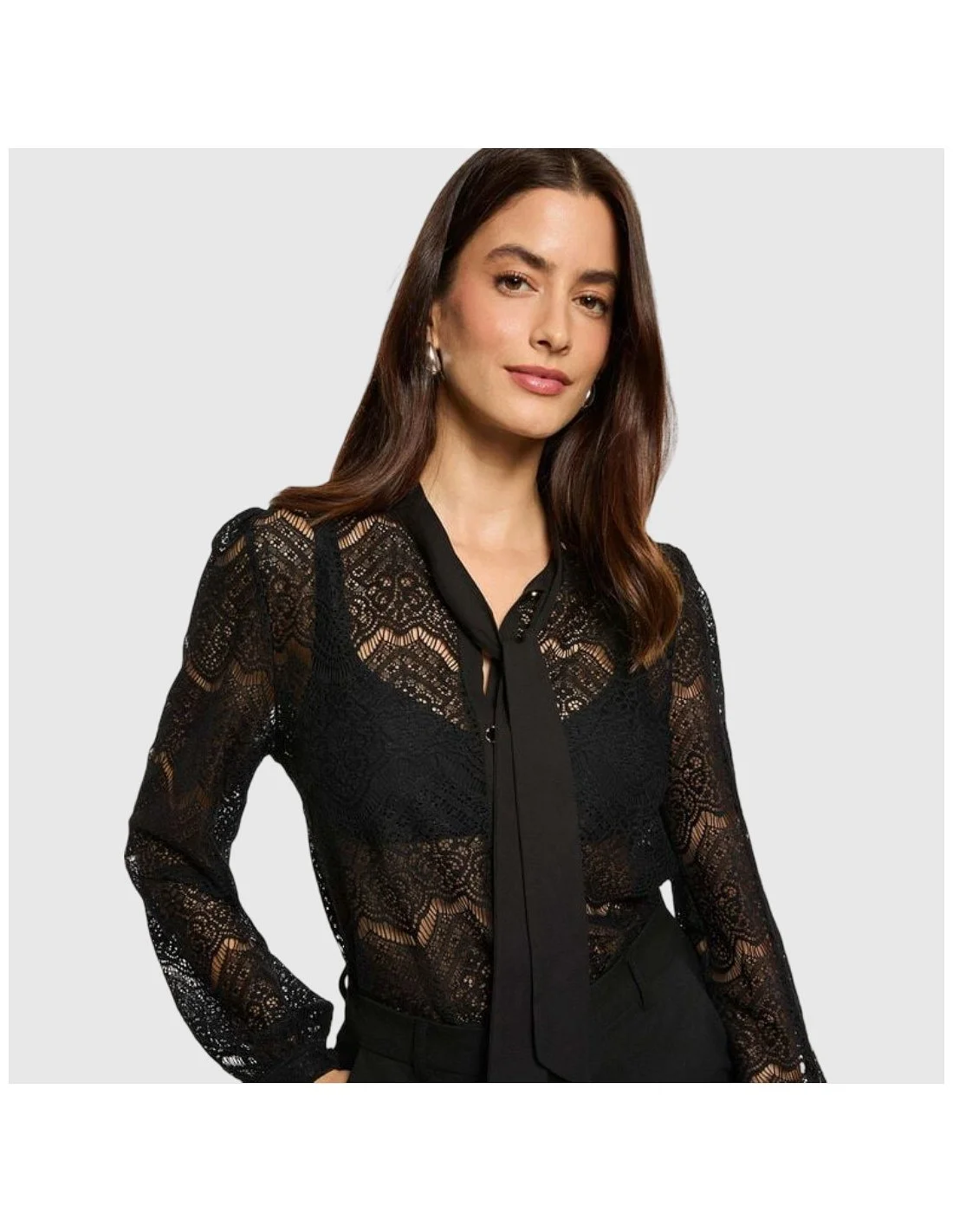 La camisa Morgan destaca por su sofisticado diseño en encaje negro semitransparente, ideal para un look elegante y moderno. Con cuello con lazo anudado, manga larga y patrón calado, aporta un toque femenino y distinguido. Su ajuste ceñido y acabado detallado la convierten en una prenda perfecta para ocasiones formales o estilismos de noche.