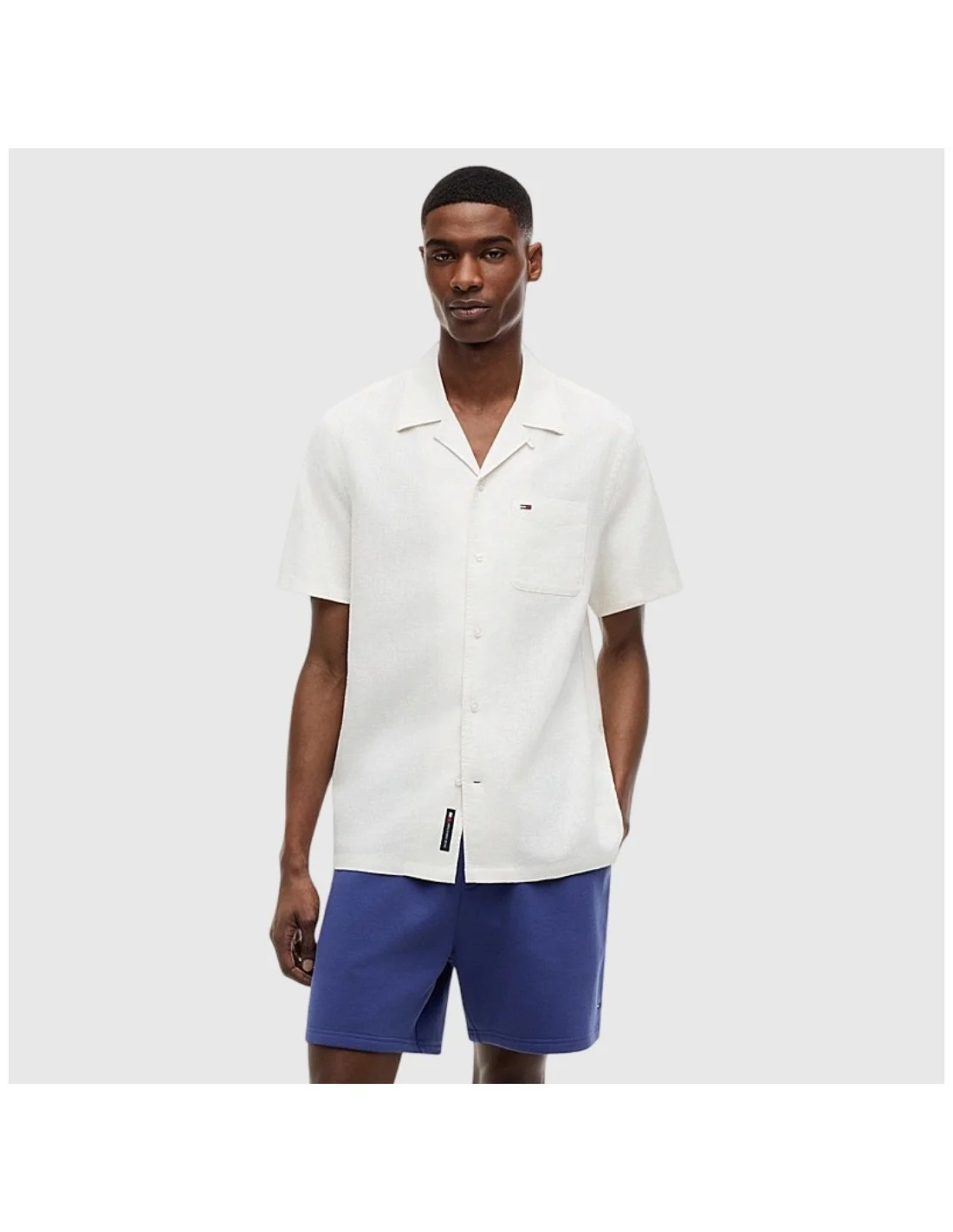 Camisa de manga corta Tommy Hilfiger en color blanco crudo. Confeccionada en tejido ligero, presenta cuello abierto tipo bowling, bolsillo en el pecho con el logo bordado y cierre frontal con botones. De estilo relajado y versátil, perfecta para looks veraniegos y casuales.