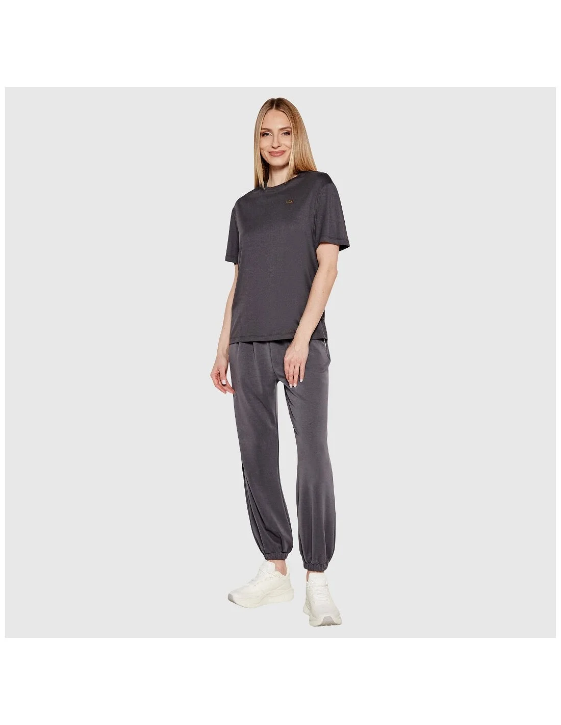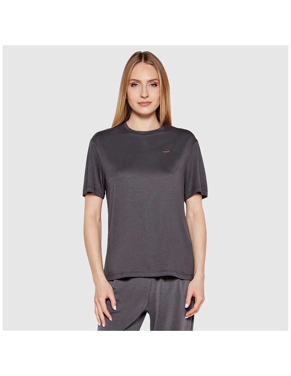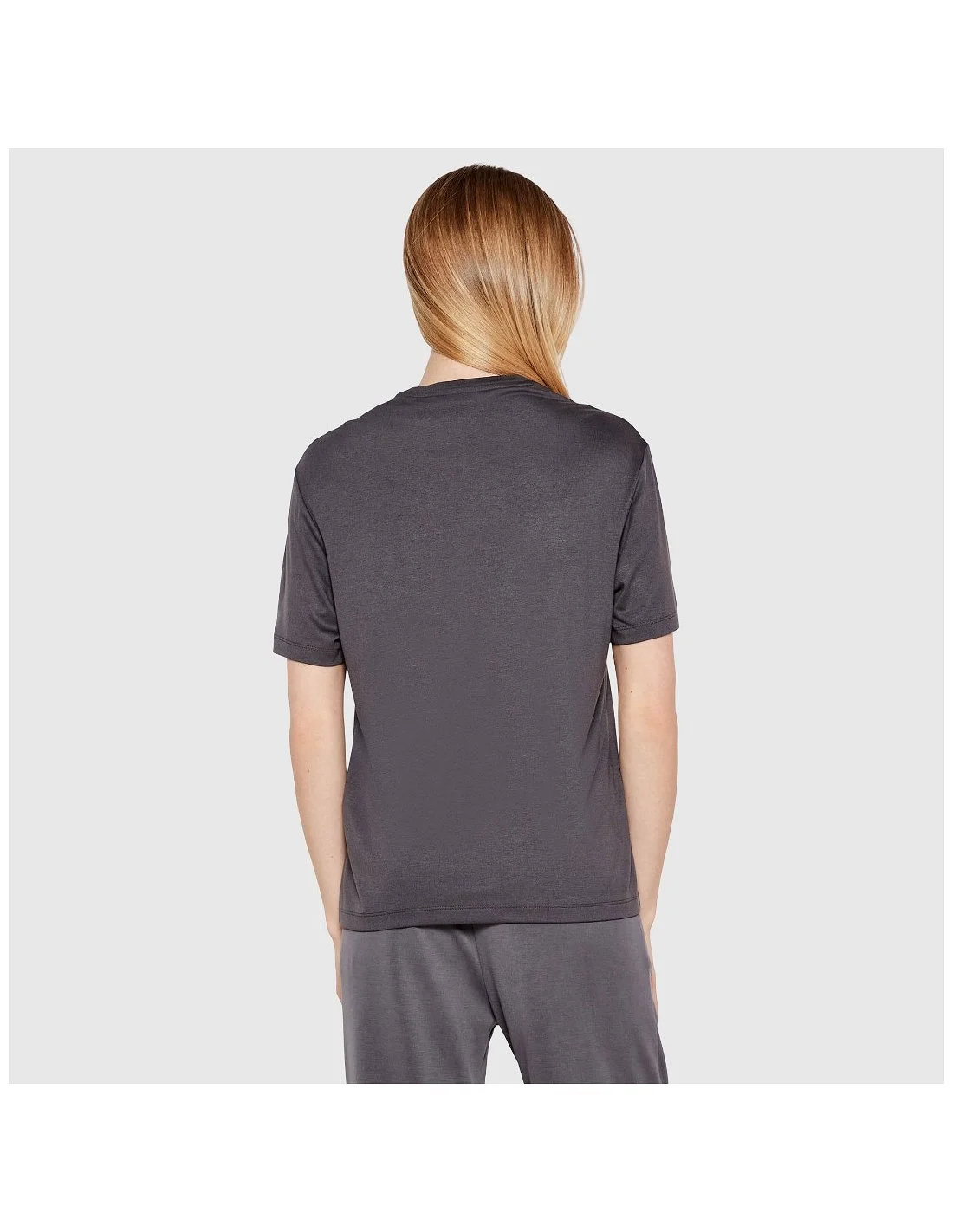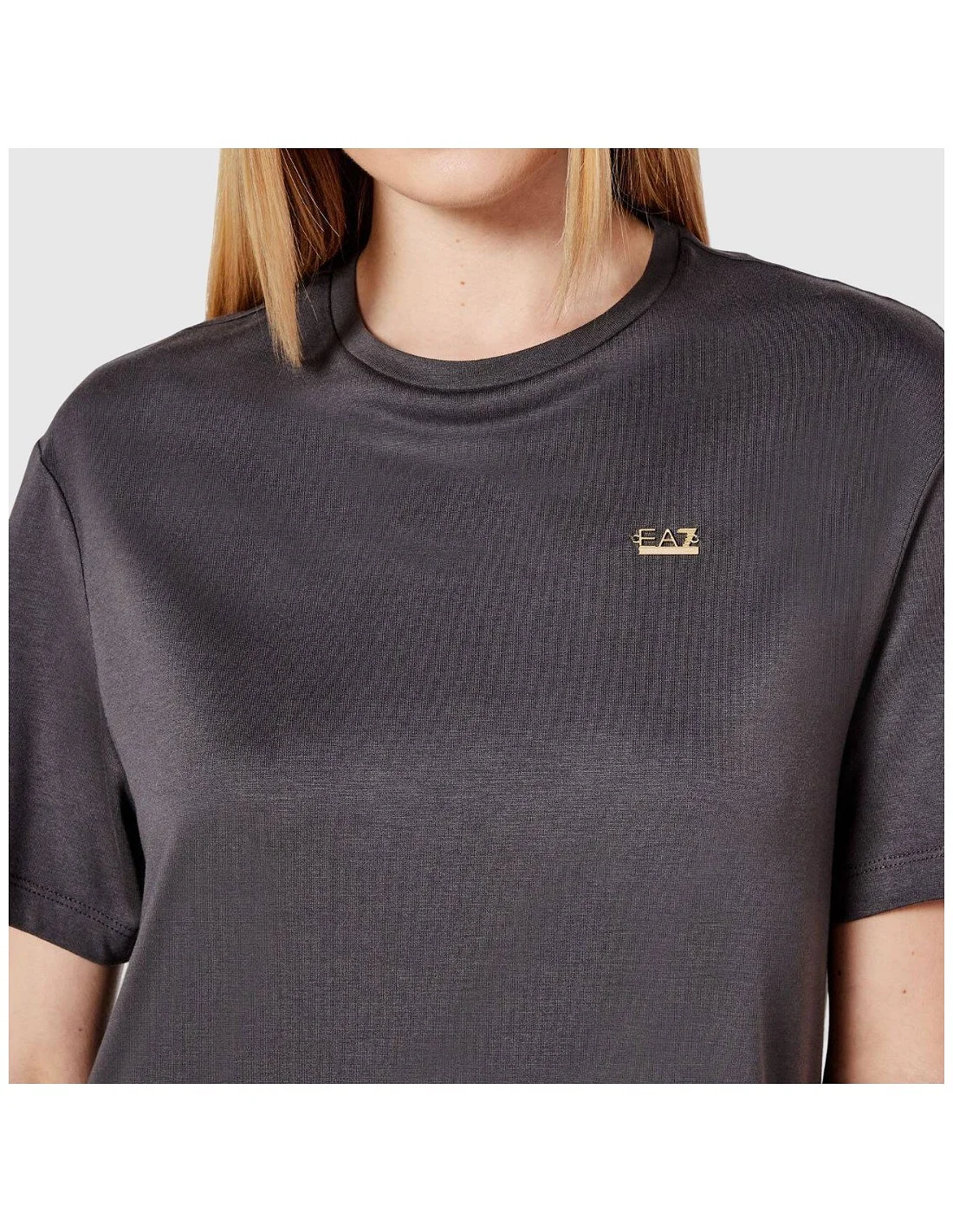 Camiseta de mujer Armani de diseño minimalista y corte recto. Presenta cuello redondo y manga corta, con el logotipo metálico EA7 en el pecho como único detalle decorativo. Ideal para un look casual y versátil, tanto para el día a día como para actividades deportivas.
