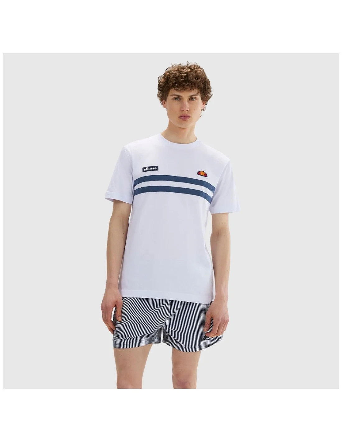 La camiseta Ellesse para hombre presenta un diseño deportivo con franjas horizontales en el pecho que aportan un estilo dinámico y reconocible. Su corte cómodo y manga corta la convierten en una opción versátil para el día a día.