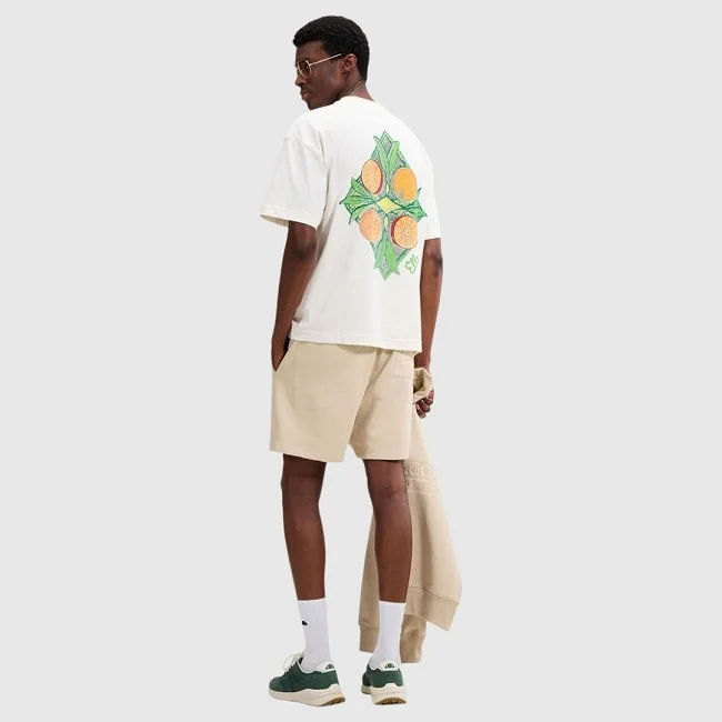 Diseñada para looks casual y streetwear, incorpora un pequeño logo frontal y un print trasero de gran formato con motivo de frutas. El cuello redondo mejora el ajuste, mientras las mangas cortas aportan libertad de movimiento.
