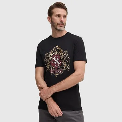 Camiseta Guess de manga corta y cuello redondo. Presenta un diseño con estampado central de estilo heráldico que incluye detalles gráficos, leones enfrentados y el logotipo de la marca enmarcado en un escudo. Una prenda moderna con un aire distintivo y elegante.