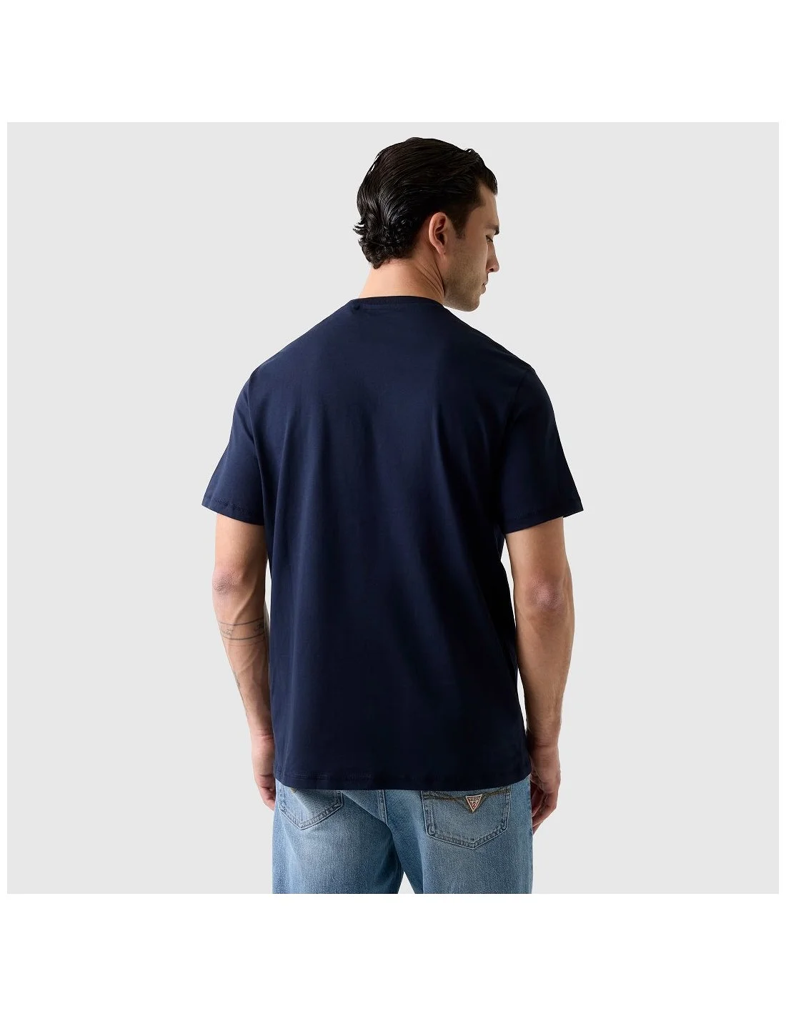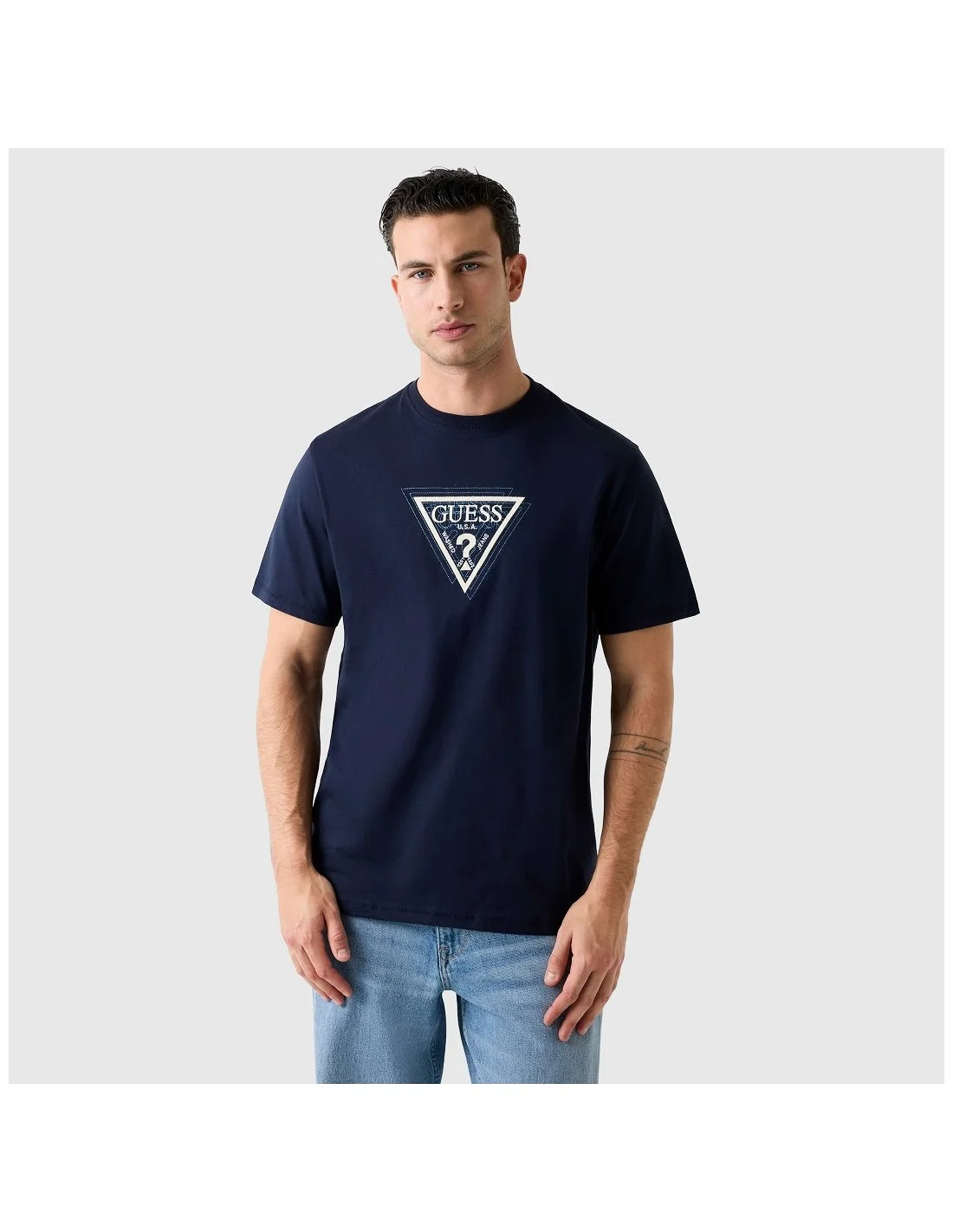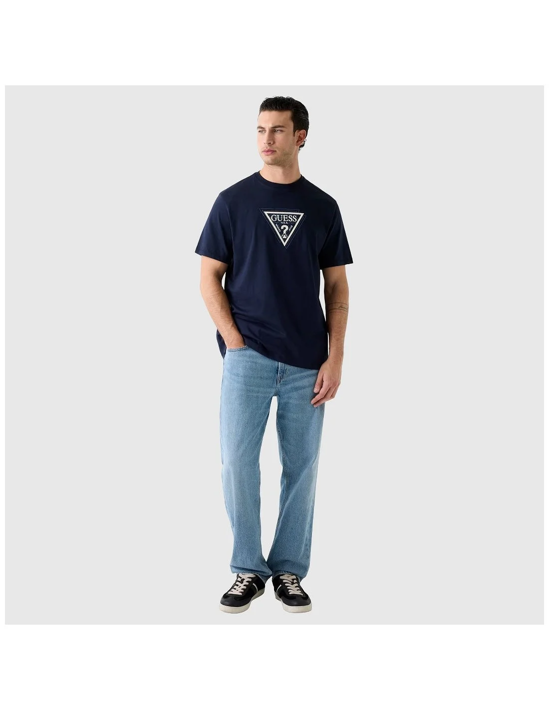 Camiseta Guess de manga corta y corte recto, confeccionada en tejido suave y cómodo. Presenta cuello redondo y gráfico frontal con el icónico triángulo de la marca y logotipo estampado. Diseño versátil y actual, ideal para completar looks casuales con un toque distintivo.