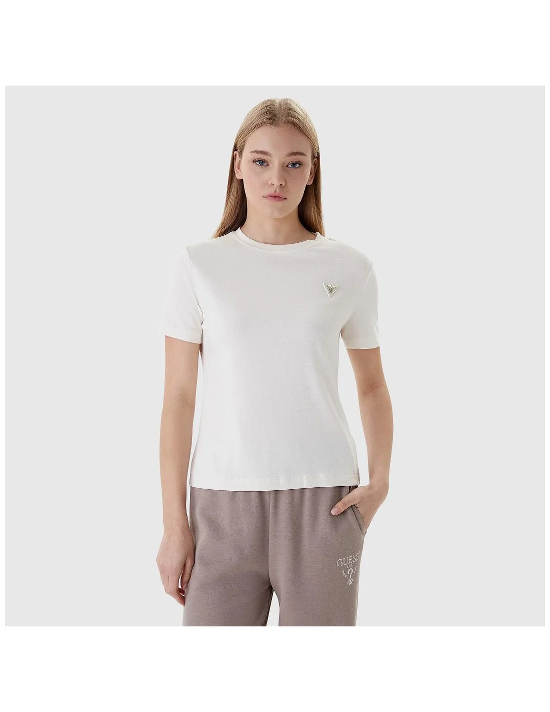 Camiseta de mujer Guess de manga corta y corte entallado. Presenta un diseño minimalista con cuello redondo y el icónico triángulo metálico de la marca en el pecho. Una prenda versátil ideal para combinar con looks casuales o deportivos.