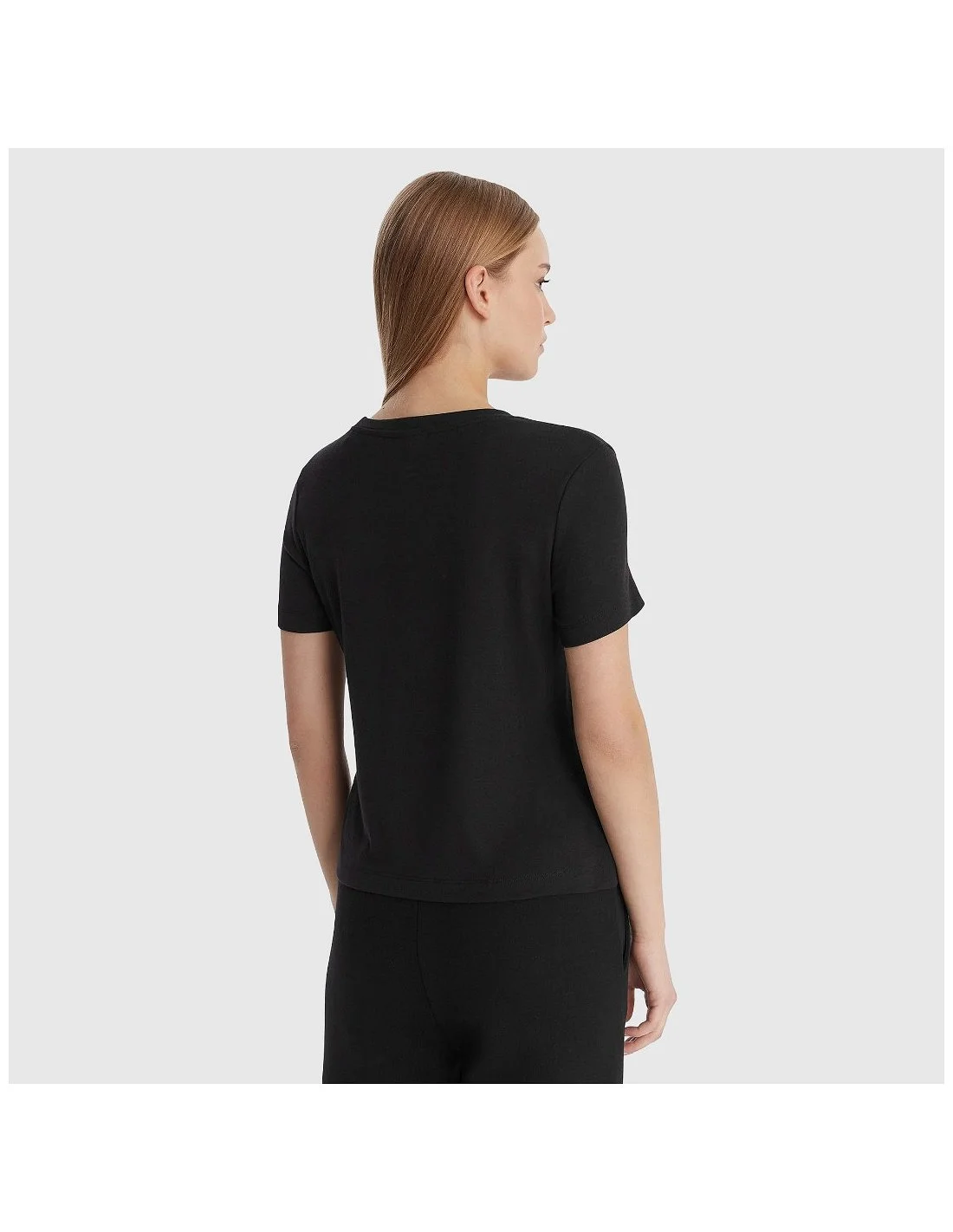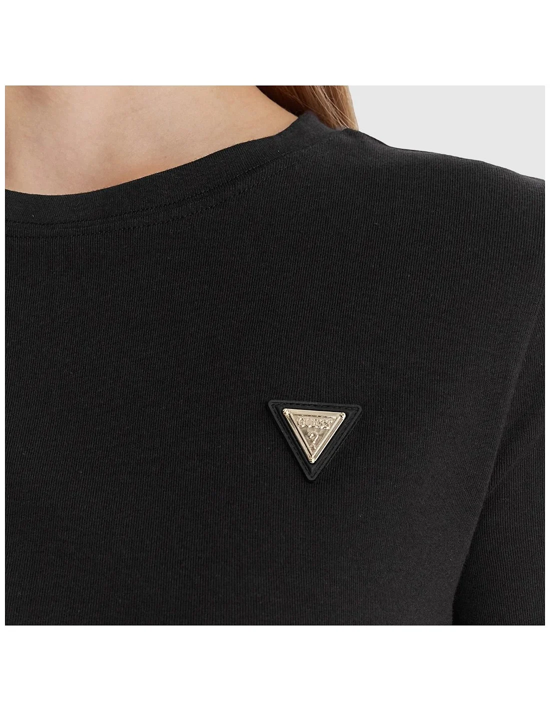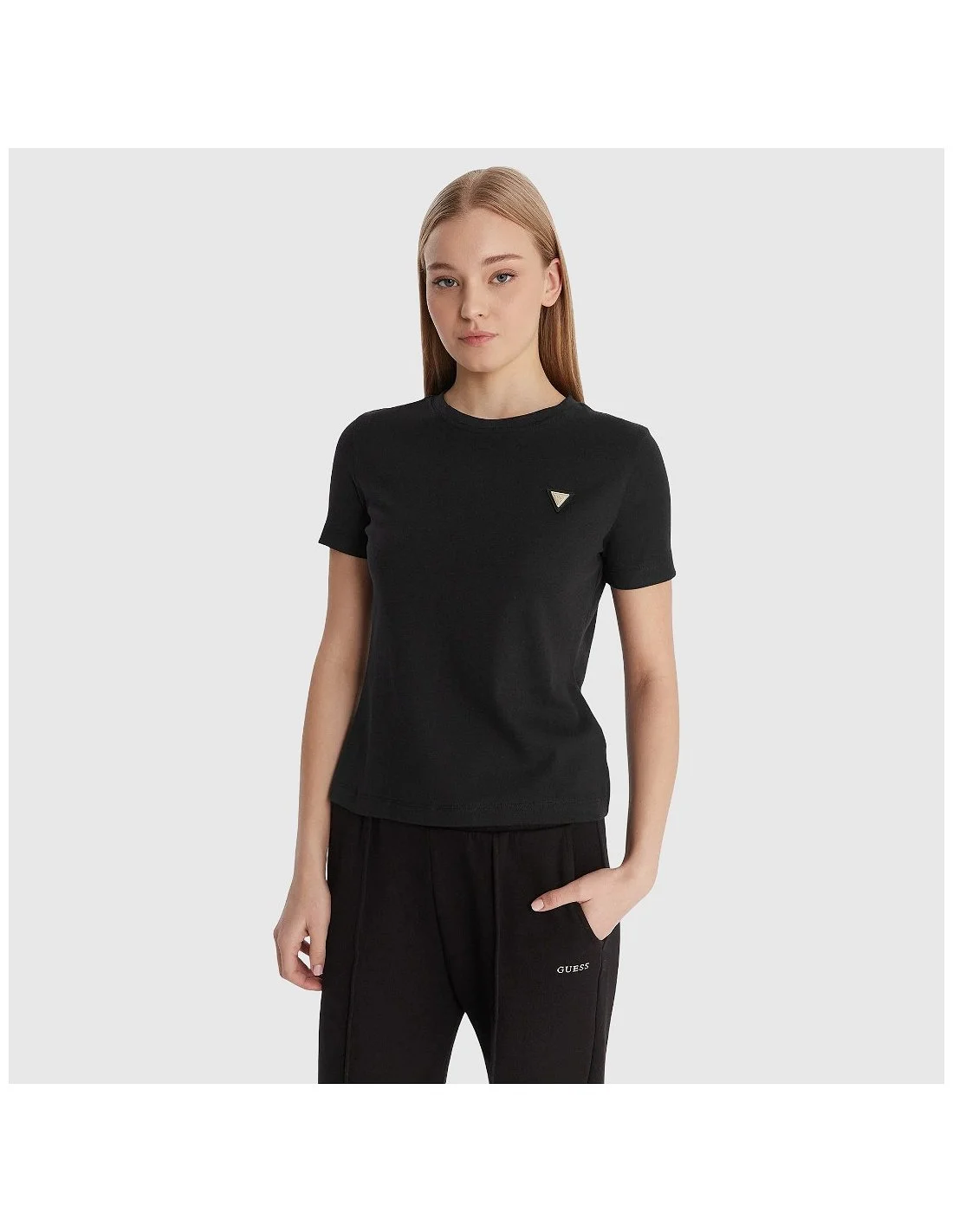 Camiseta de mujer Guess de manga corta y corte entallado. Presenta un diseño minimalista con cuello redondo y el icónico triángulo metálico de la marca en el pecho. Una prenda versátil ideal para combinar con looks casuales o deportivos.