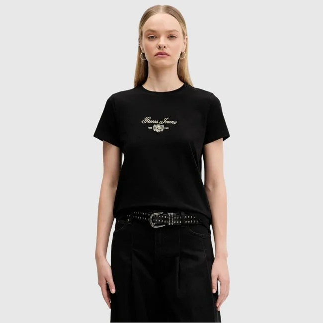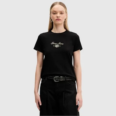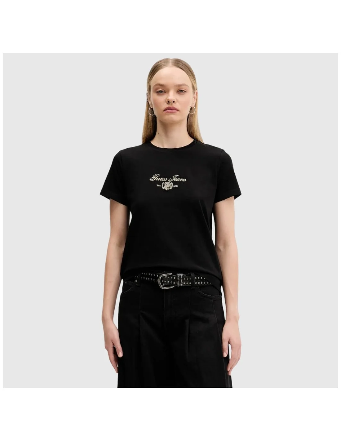 Camiseta de Guess para mujer con diseño clásico de cuello redondo y manga corta. Confeccionada en algodón suave, destaca por el bordado frontal con el logotipo de la marca y un emblema estilo universitario que aporta un aire distintivo. Su corte recto la convierte en una prenda versátil, ideal para combinar con jeans o faldas en looks casuales y urbanos.