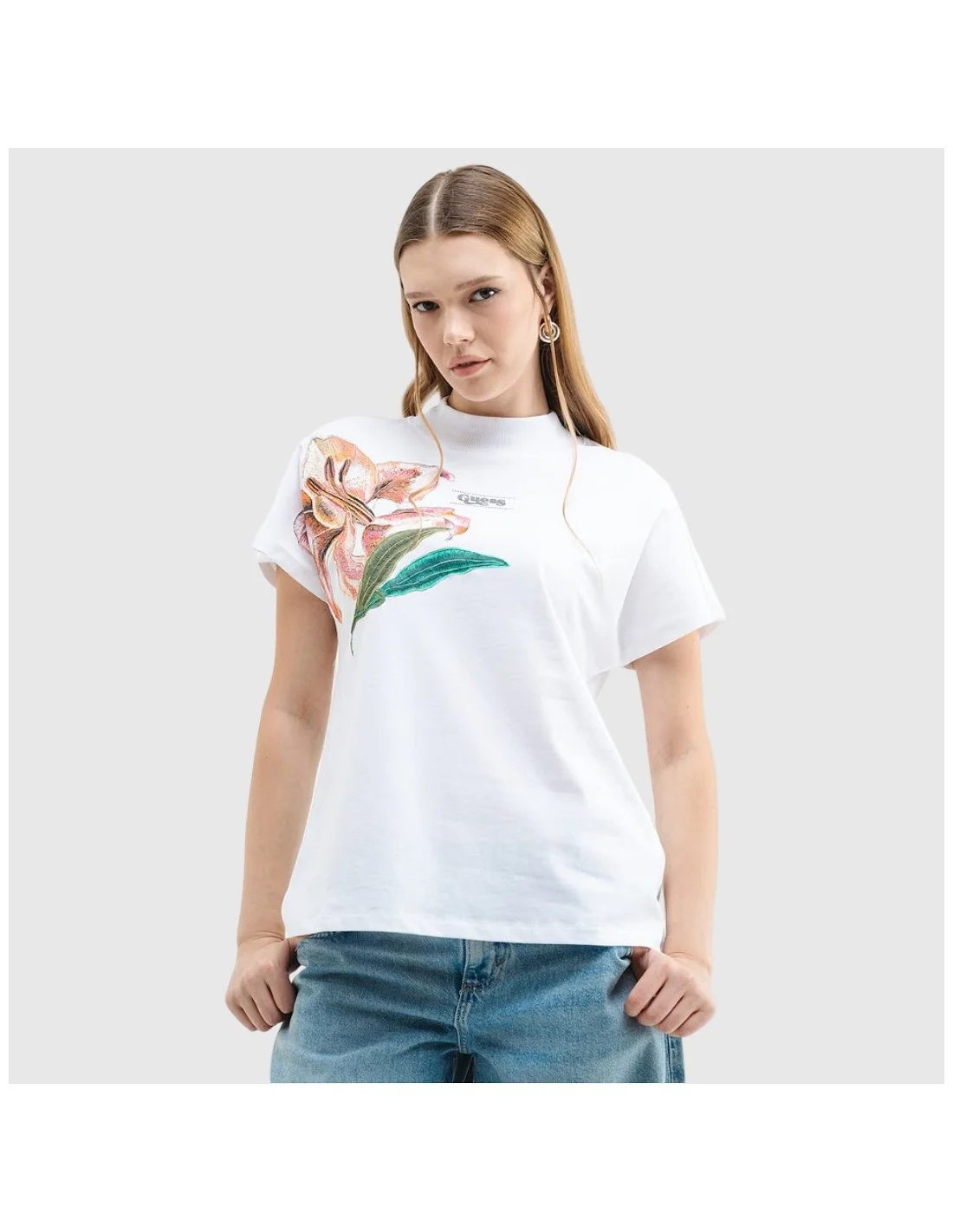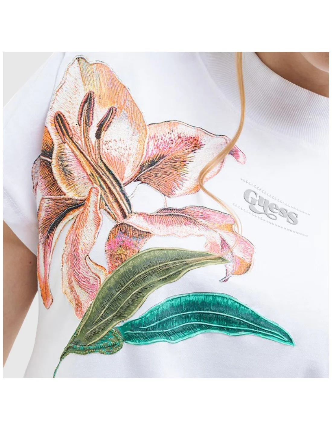 La camiseta de mujer Guess destaca por su diseño floral bordado en la parte frontal, que aporta un toque artístico y femenino. Confeccionada en algodón, ofrece un ajuste cómodo y relajado ideal para el día a día. El cuello redondo y las mangas cortas complementan su estilo casual con un acabado moderno. Perfecta para looks desenfadados con un punto distintivo.