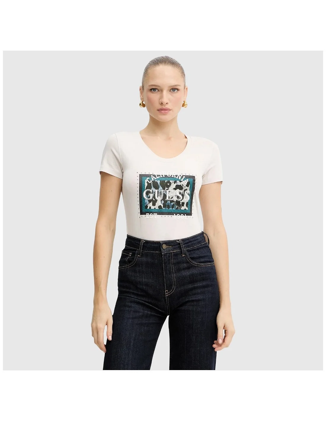 La camiseta Guess para mujer ofrece un diseño casual con un toque distintivo. Confeccionada en algodón orgánico, presenta un estampado central con el logotipo Guess enmarcado por detalles gráficos y pequeñas aplicaciones metálicas. Su corte ajustado y cuello redondo la convierten en una opción versátil para looks urbanos o informales.