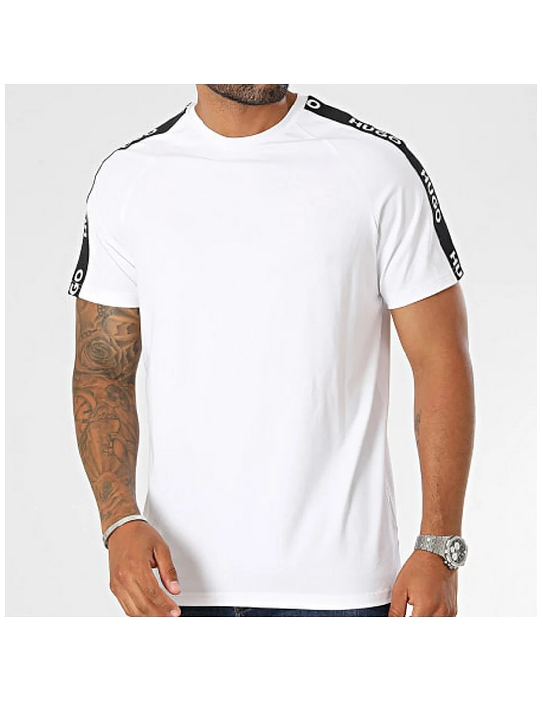 95% Algodón, 5% Elastano. Corte clásico. Cuello redondo. Banda con repetición de logo HUGO a lo largo de las mangas.