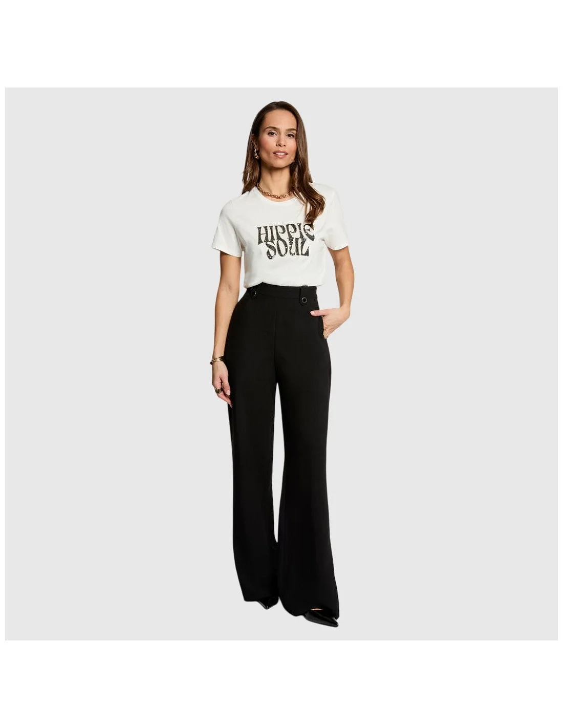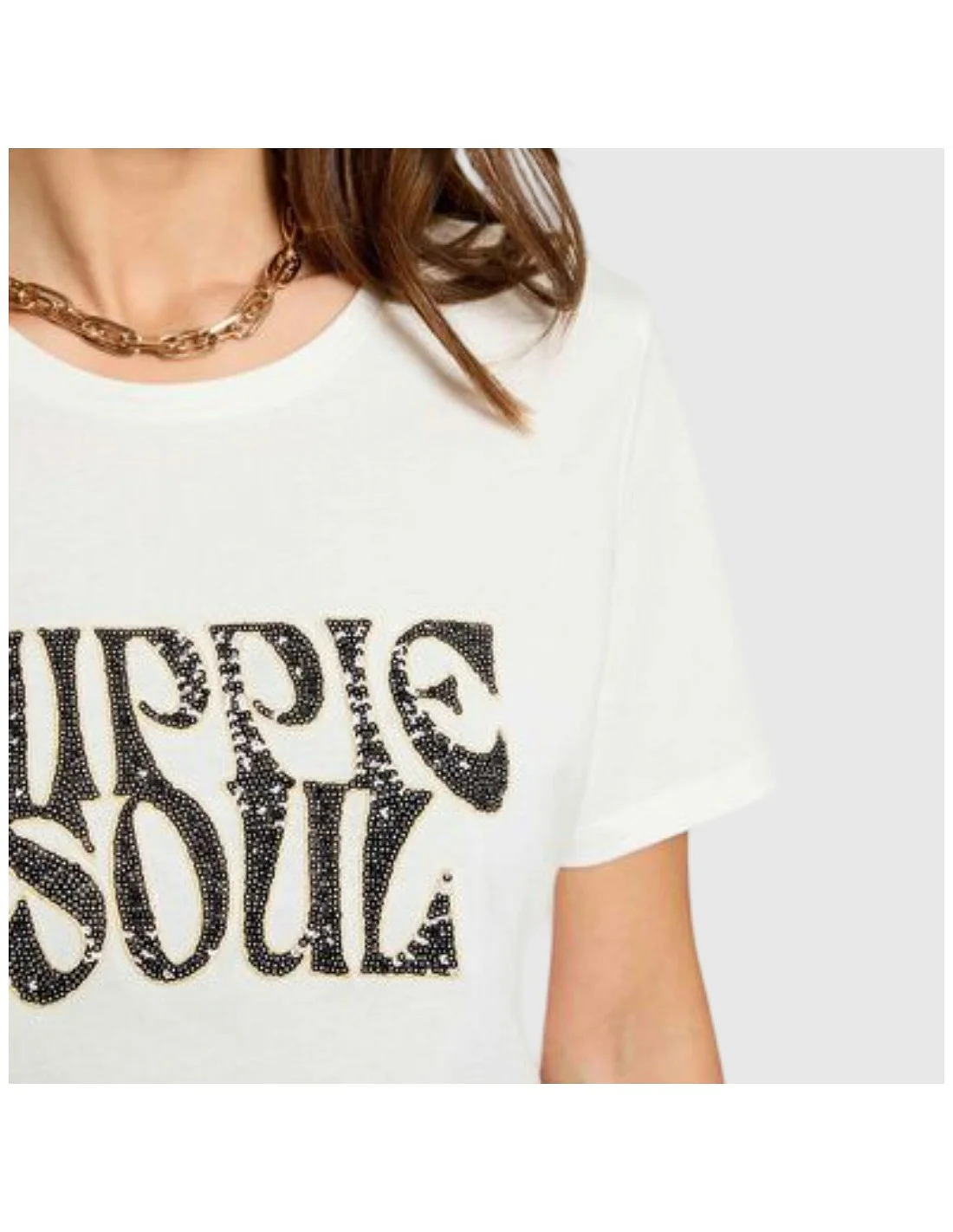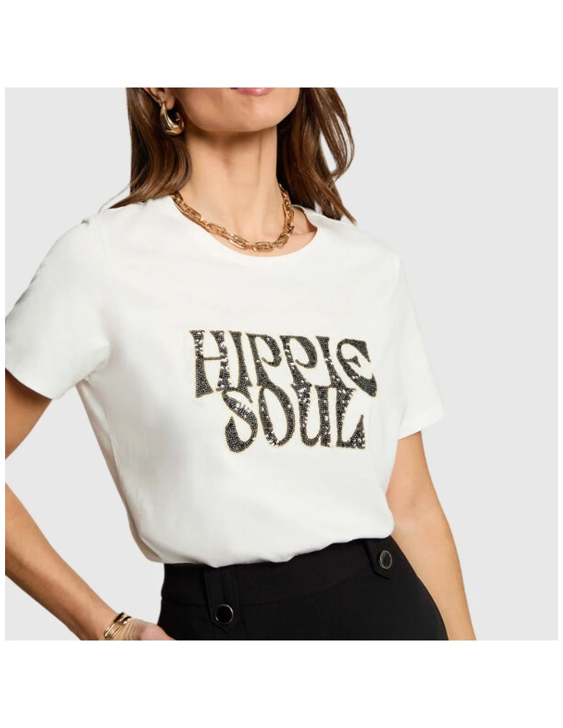Camiseta Morgan de manga corta con cuello redondo y corte recto. Incluye un estampado frontal decorado con detalles brillantes, ideal para aportar personalidad y estilo a tus looks casuales.