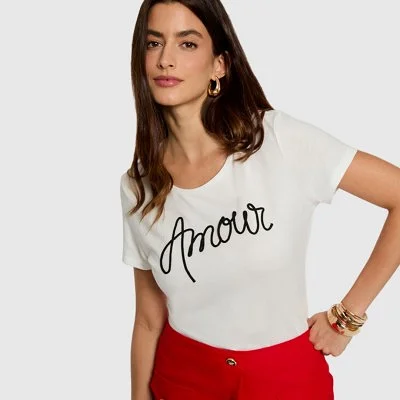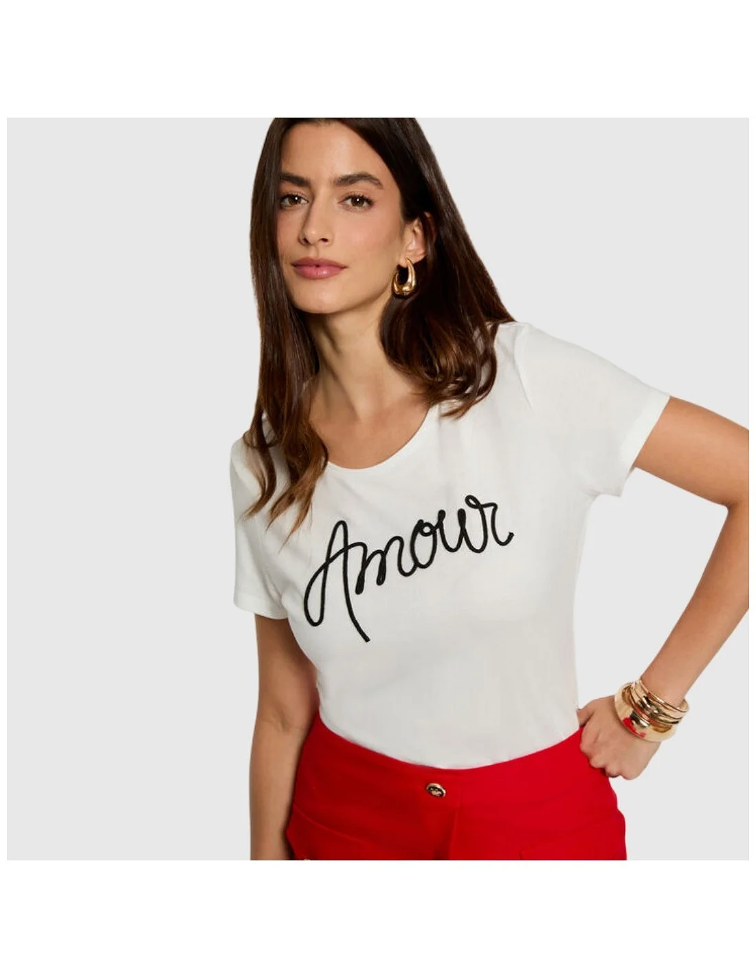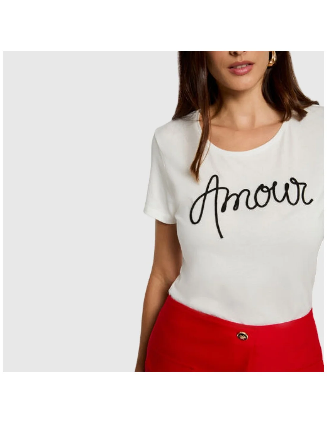 La camiseta de la marca Morgan ofrece un estilo femenino y moderno con ajuste entallado y cuello redondo. Confeccionada en algodón suave, destaca por el bordado frontal, que añade un toque romántico y distintivo. Ideal para looks casuales con un aire chic y parisino.
