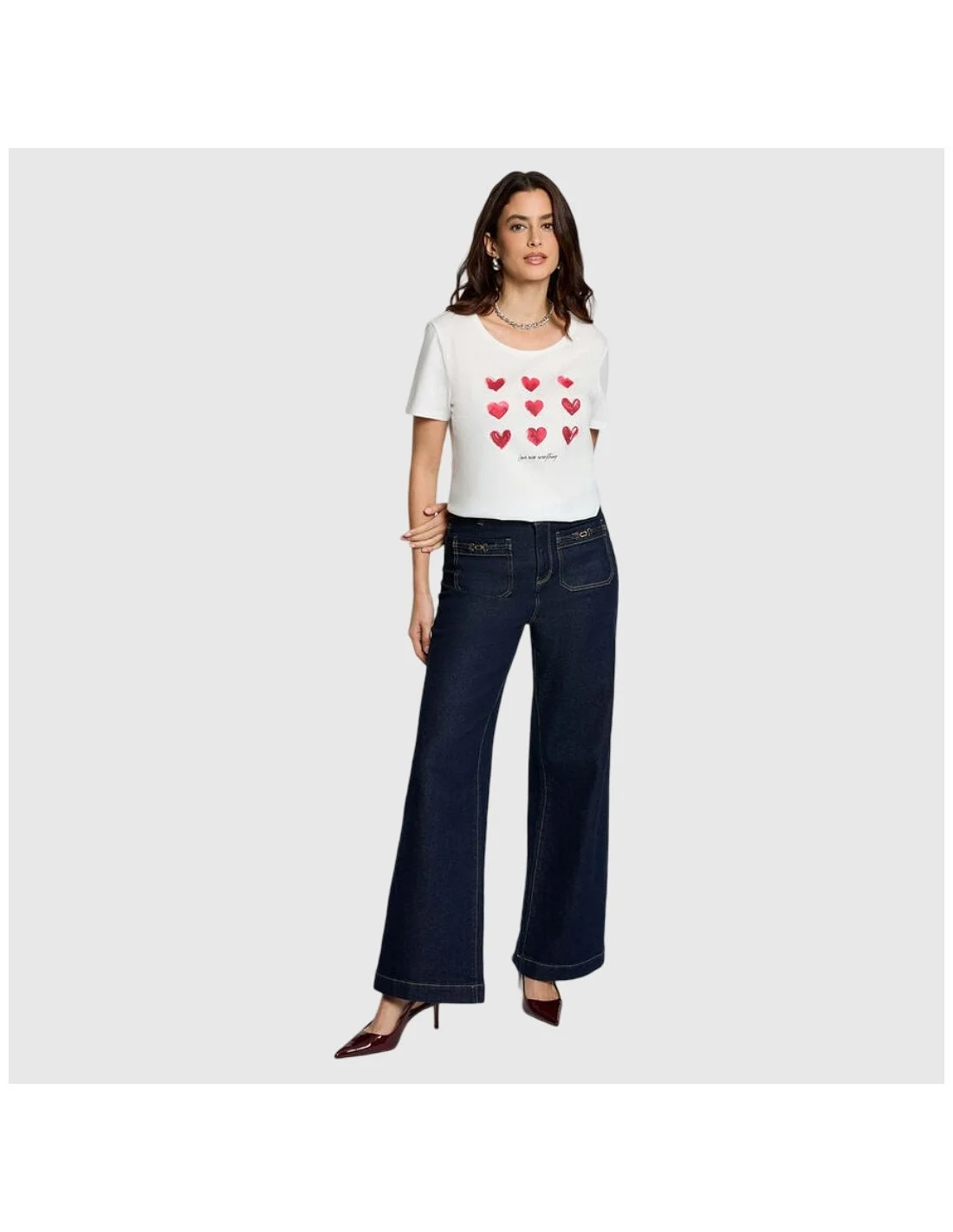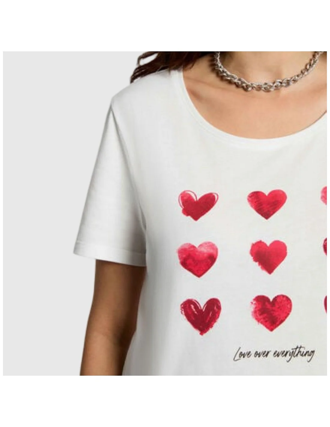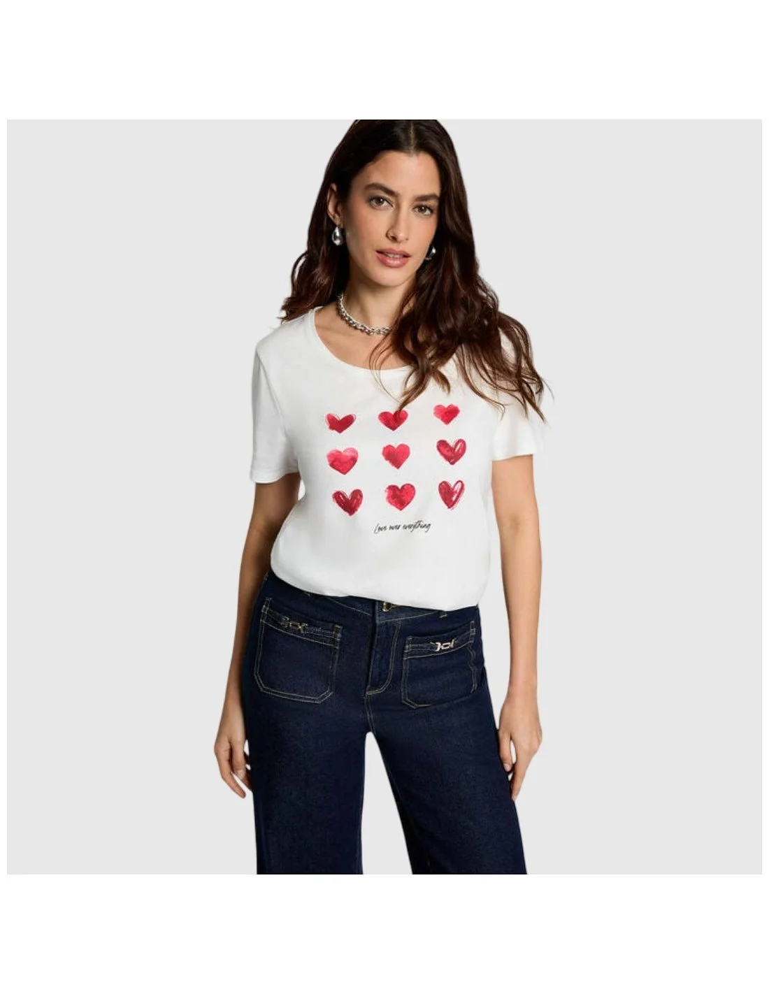 Camiseta Morgan de manga corta con escote redondo y corte recto. Presenta un estampado frontal de corazones con acabado brillante y mensaje decorativo, ideal para un look casual con un toque romántico.