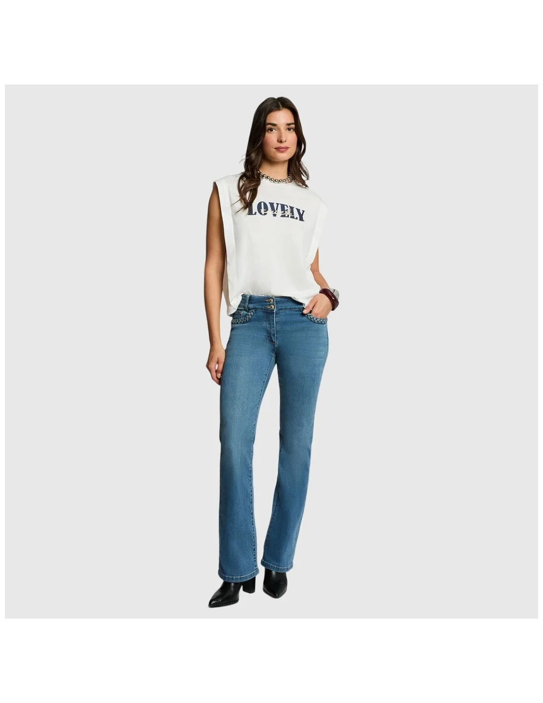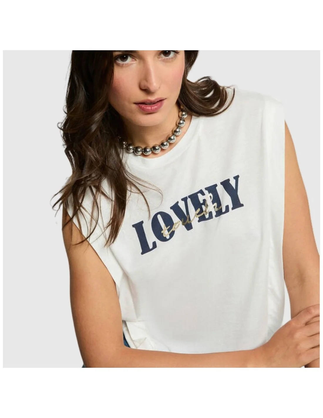 Camiseta sin mangas con diseño de hombros marcados y escote redondo. Presenta un estampado frontal con la palabra ?LOVELY? en tipografía llamativa, ideal para un look urbano con actitud.