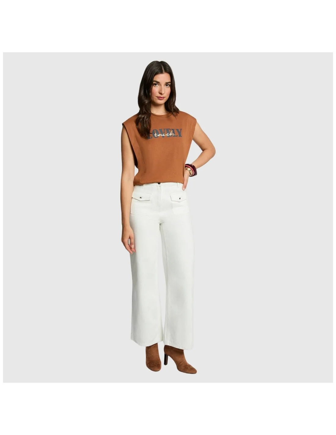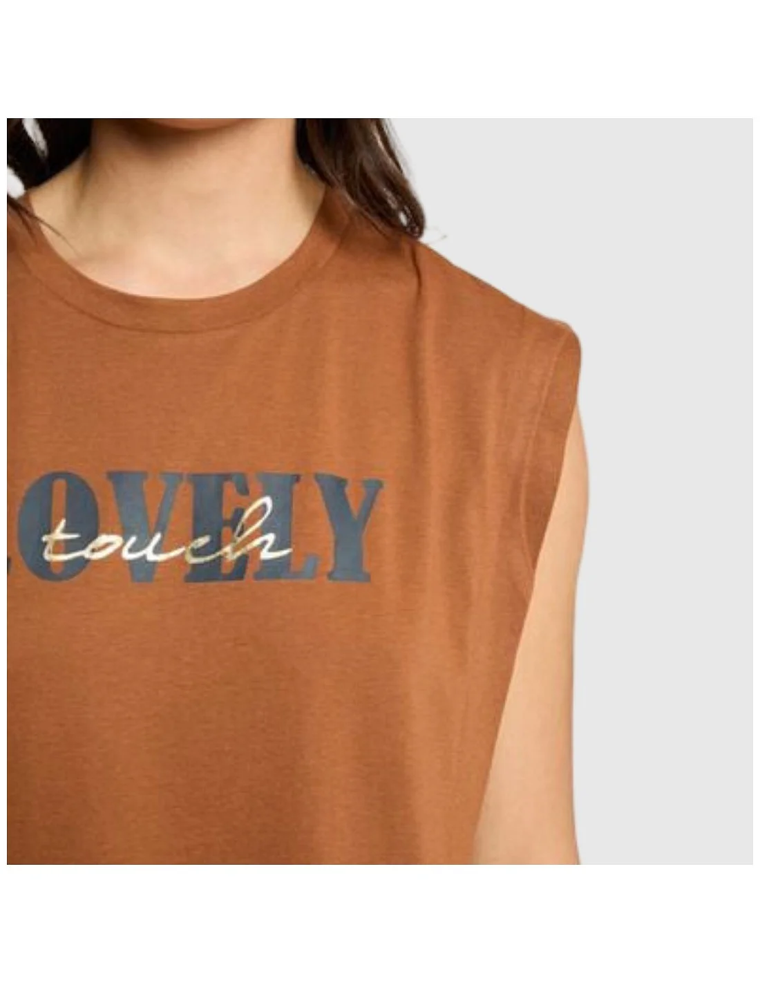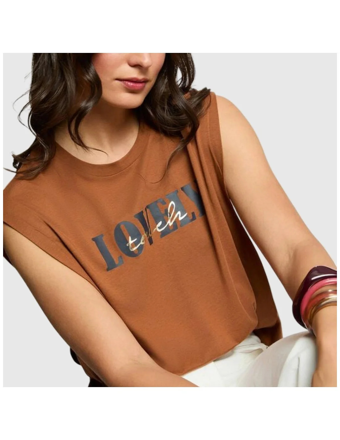 Camiseta sin mangas con diseño de hombros marcados y escote redondo. Presenta un estampado frontal con la palabra ?LOVELY? en tipografía llamativa, ideal para un look urbano con actitud.