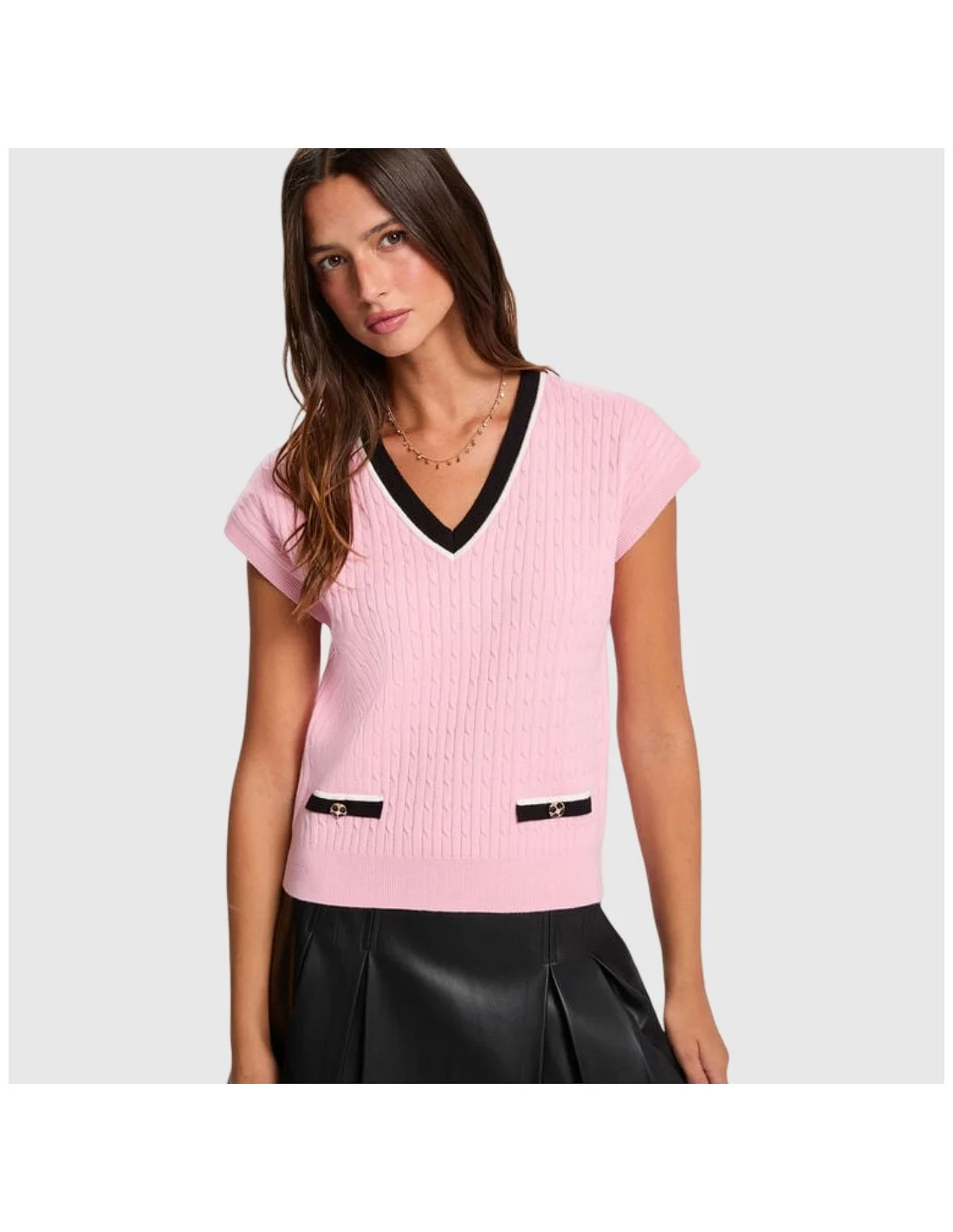 El chaleco de punto de Morgan ofrece un diseño sin mangas con cuello en pico acentuado por ribetes en contraste. El tejido de canalé con trenza aporta textura, mientras que los bolsillos decorativos con botones dorados añaden un toque elegante. Ideal para crear looks preppy o combinar con camisas y faldas para un estilo actual y femenino.
