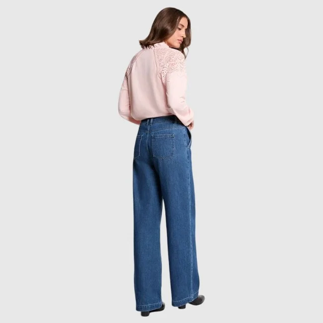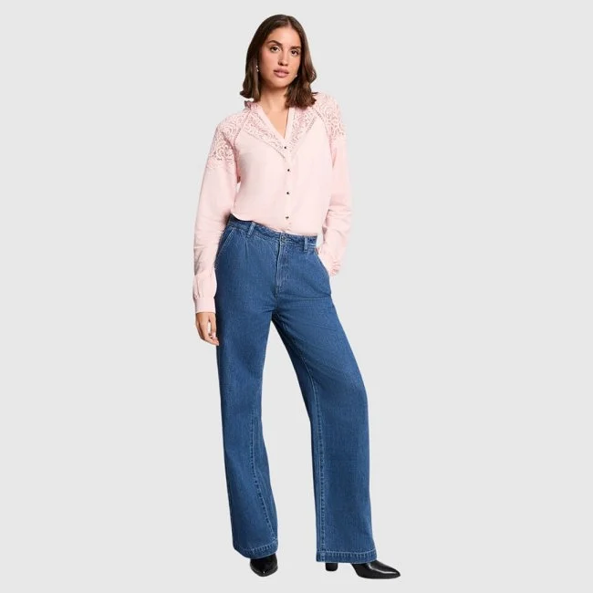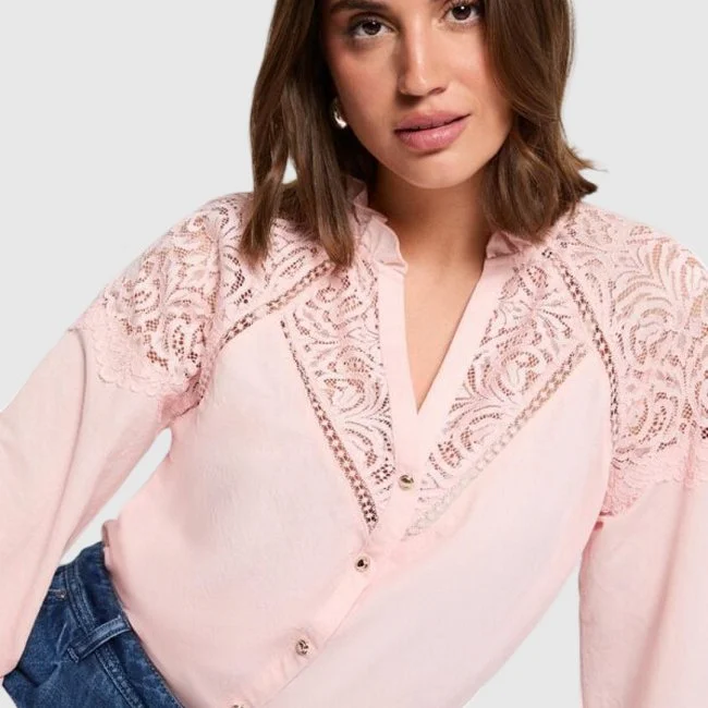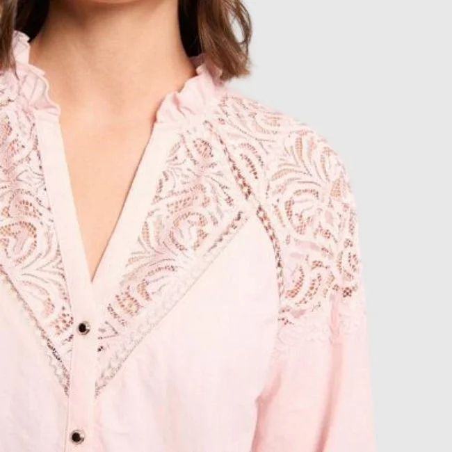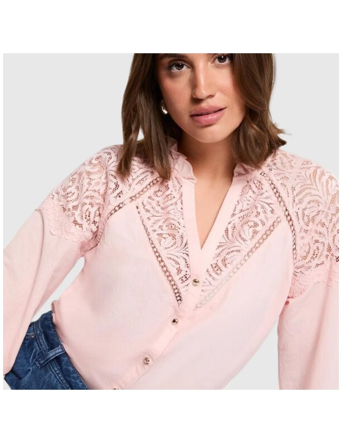 La blusa de Morgan combina delicadeza y sofisticación con un diseño de manga larga y escote en pico. Destaca por los detalles de encaje calado en hombros y parte superior delantera, que aportan un toque romántico. El cierre frontal con botones y el corte fluido la convierten en una prenda ideal para estilismos elegantes o de oficina con un aire femenino.