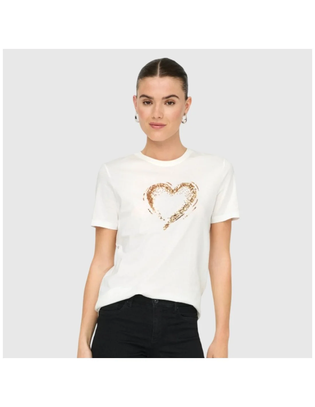 La camiseta de ONLY es una prenda casual con un toque romántico y moderno. Confeccionada en algodón suave, presenta un diseño de corte recto y cuello redondo. El detalle central con lentejuelas brillantes, que aporta un aire femenino y llamativo. Ideal para combinar con jeans o faldas, es perfecta para el día a día o planes informales.