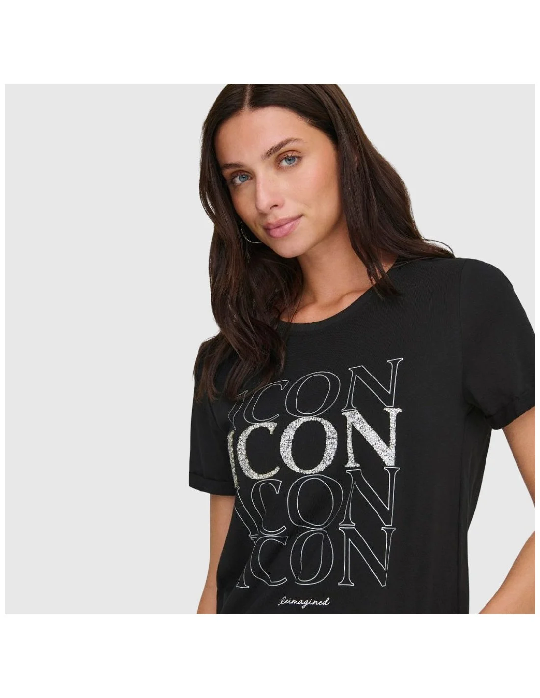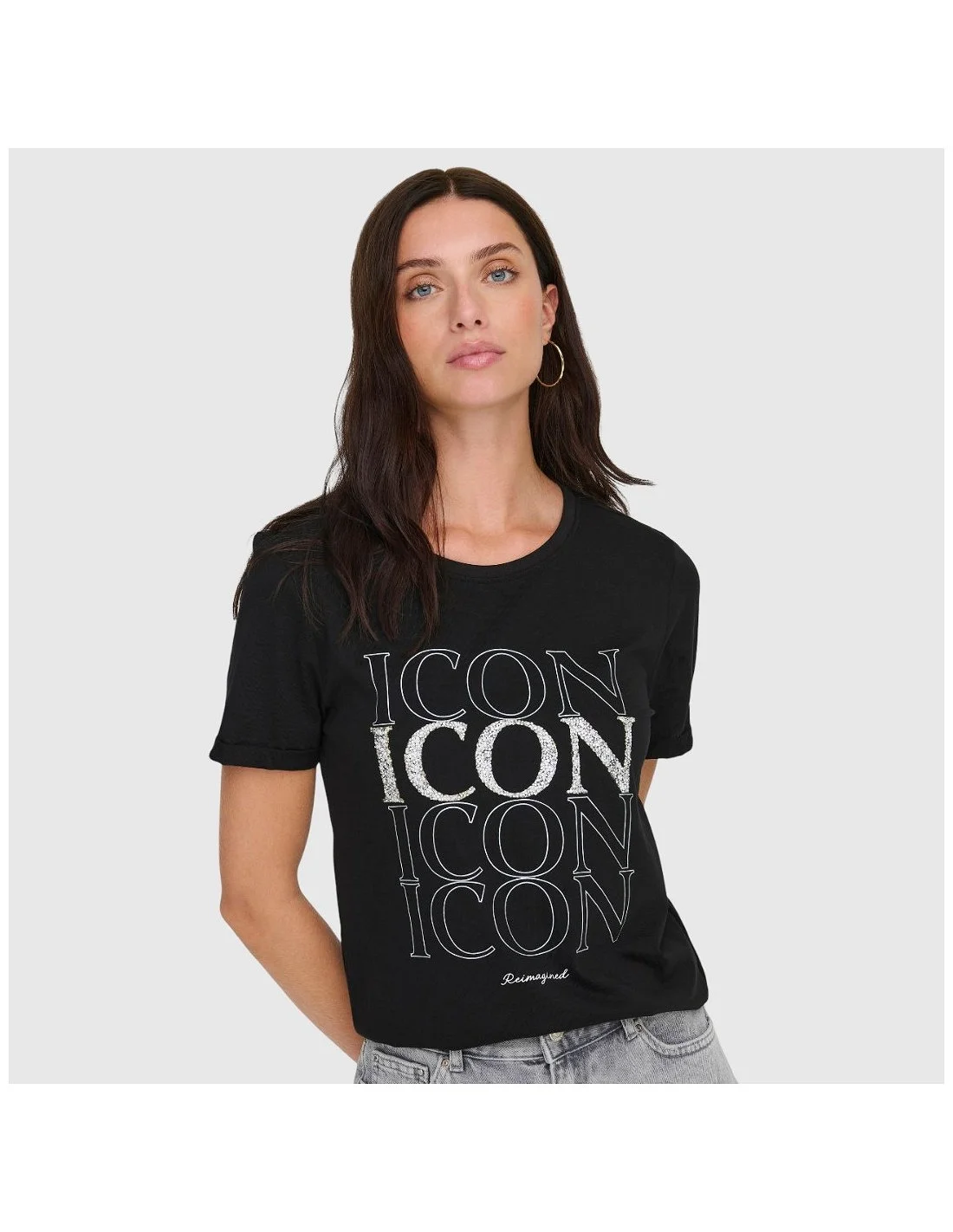 La camiseta de mujer de ONLY destaca por su estampado frontal con texto repetido y detalles brillantes que aportan un toque llamativo. De corte recto y cuello redondo, está confeccionada en algodón suave para un uso cómodo. Ideal para outfits casuales con un giro moderno y gráfico.