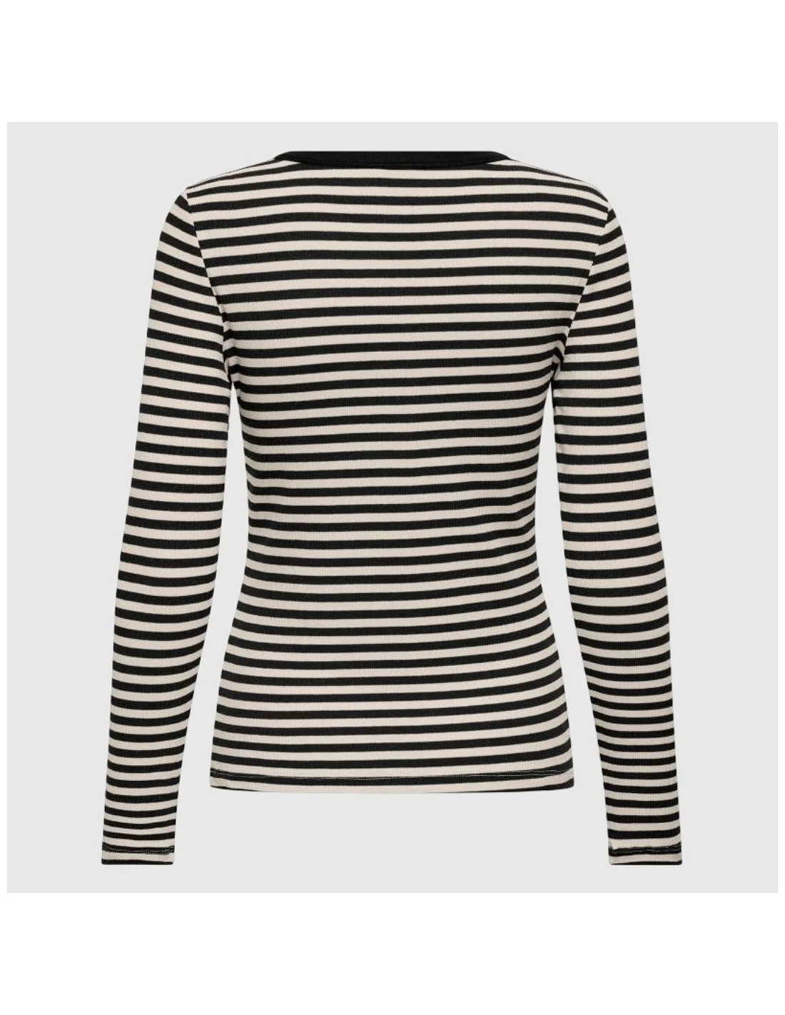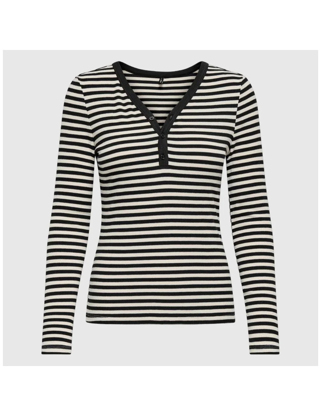 La camiseta de manga larga para mujer de ONLY presenta un diseño de rayas horizontales con escote en pico y cierre parcial de botones. Confeccionada en tejido de canalé, se ajusta al cuerpo sin perder comodidad. Su estilo versátil la convierte en una opción ideal para combinar con jeans o faldas en looks casuales y cotidianos.