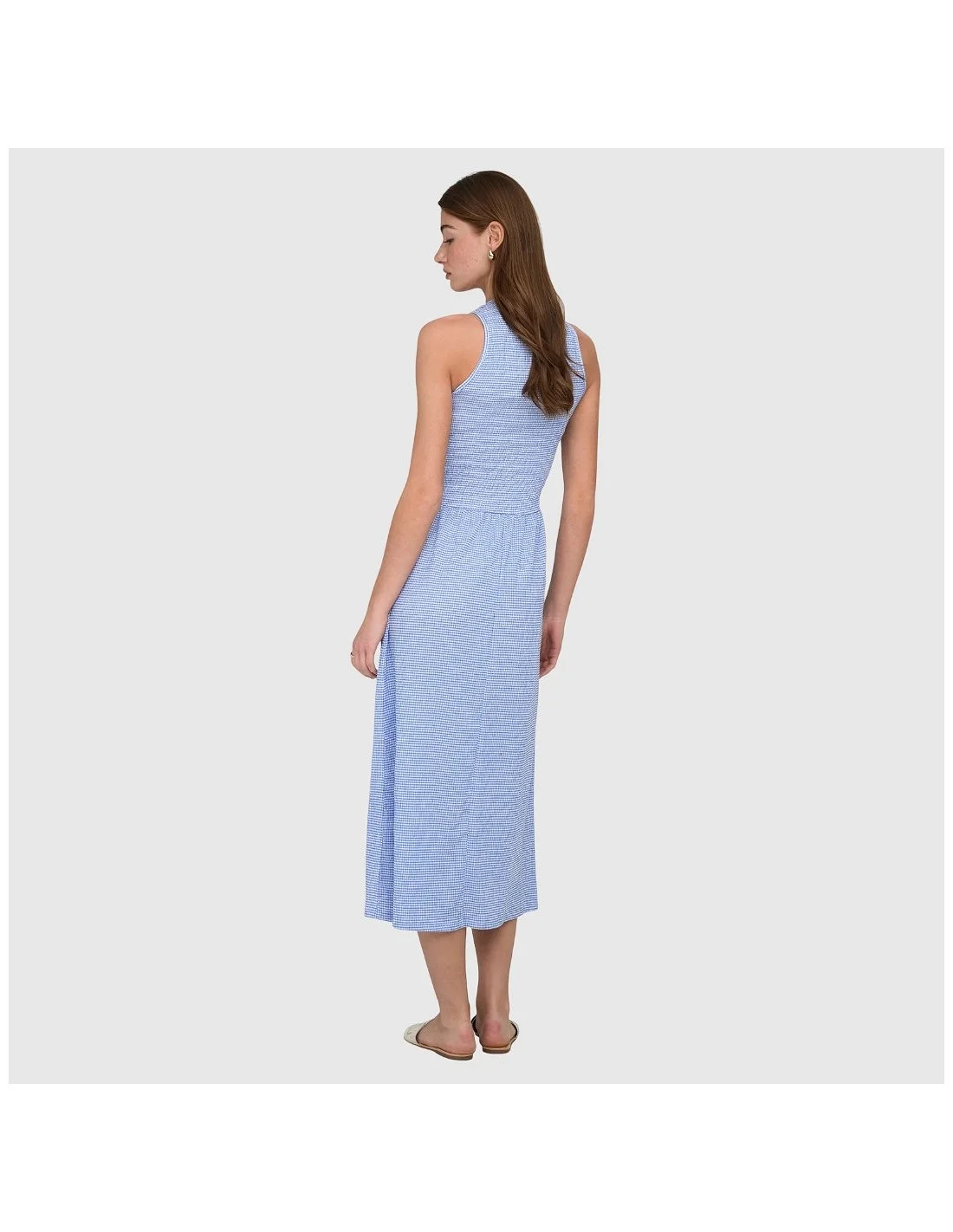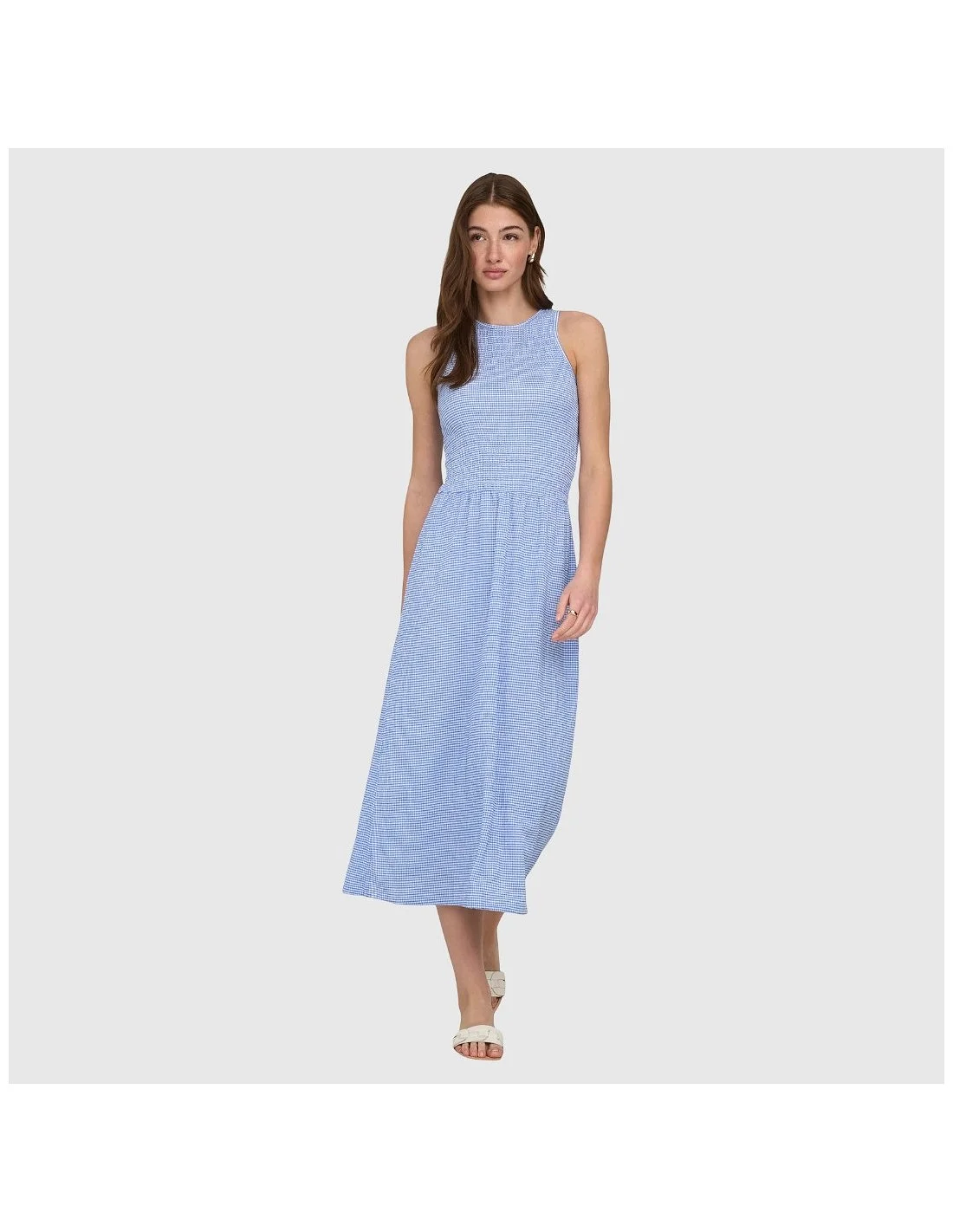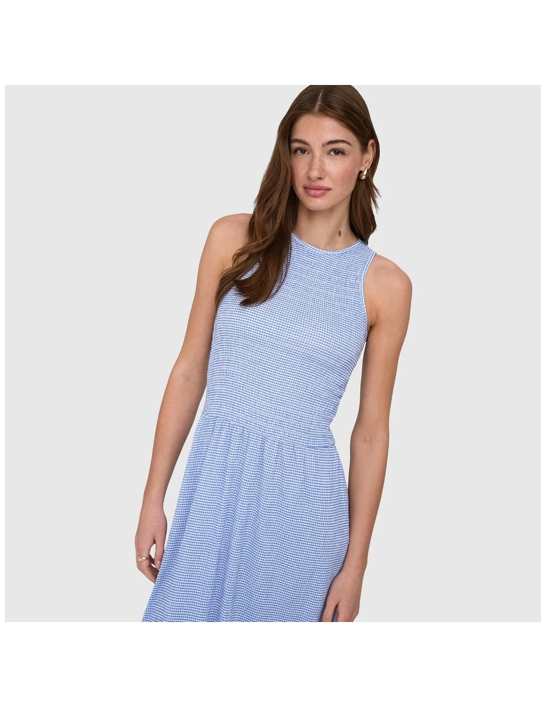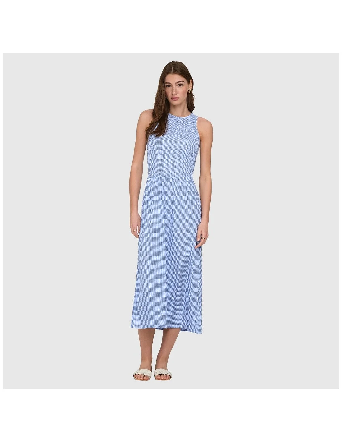 Vestido ONLY de corte midi con diseño sin mangas y silueta ajustada en la parte superior que realza la figura. Presenta cuello redondo y cintura definida que da paso a una falda con caída fluida y movimiento natural. Confeccionado en tejido ligero y cómodo, incorpora un estampado discreto que aporta un toque sofisticado y versátil. Ideal para looks tanto de día como de noche, combinando fácilmente con botas o calzado más formal.
