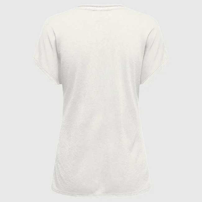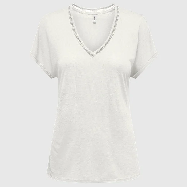 La camiseta Only para mujer destaca por su diseño fluido con cuello pico y detalle calado decorativo, aportando un estilo casual y actual. Su manga corta y corte relajado ofrecen comodidad para el uso diario.