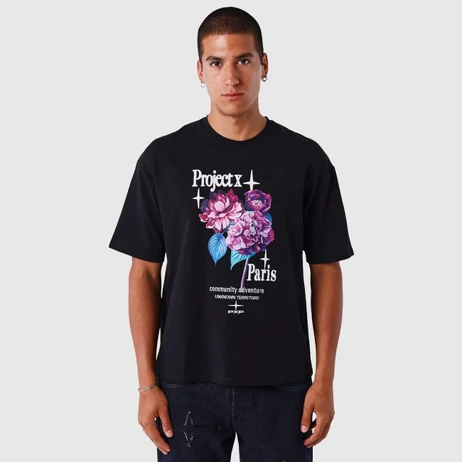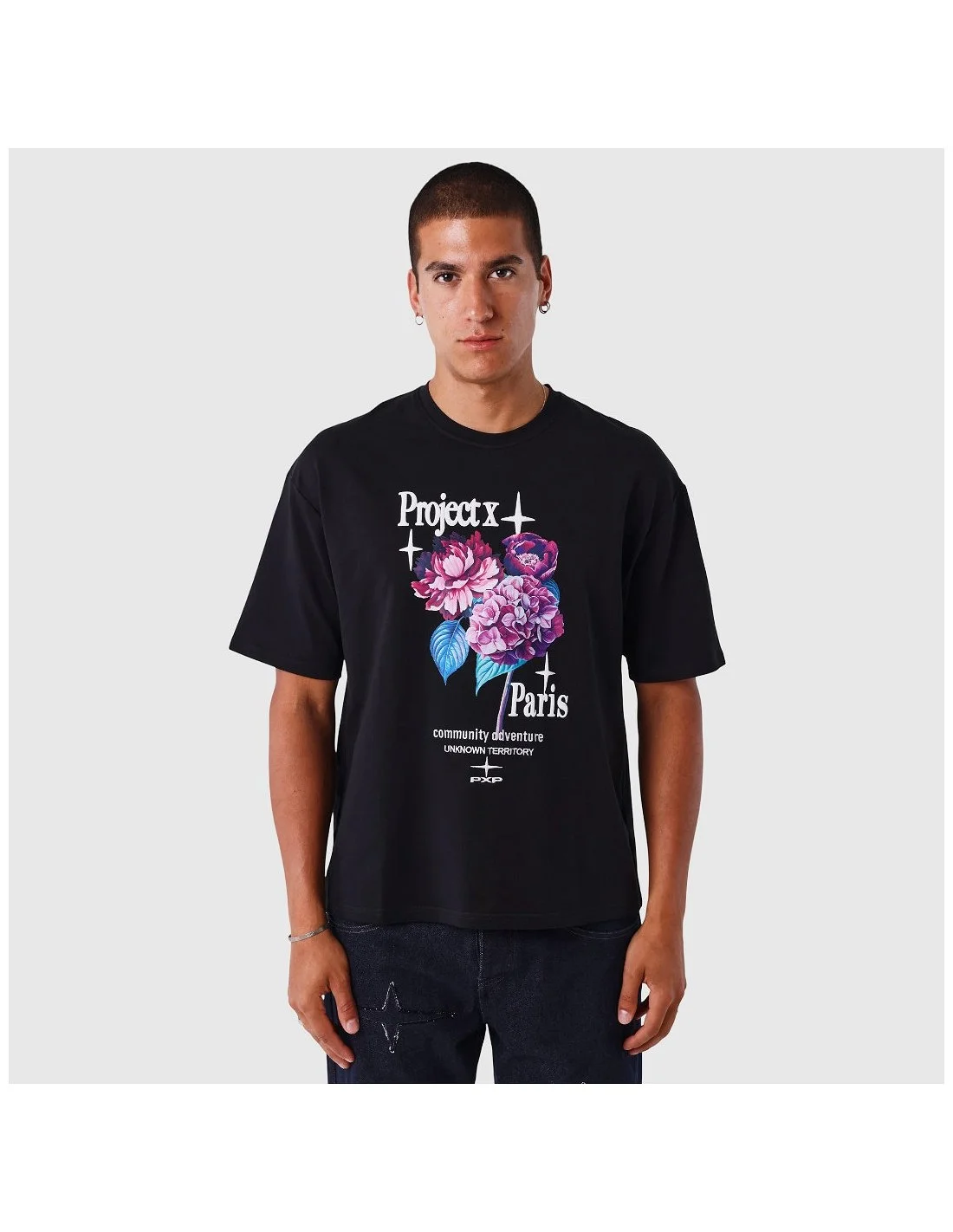 Camiseta Project x Paris de corte relaxed fit con estampado floral y tipografía en la parte frontal. Confeccionada en algodón suave, presenta cuello redondo de canalé y detalle de logo en la espalda. Una prenda versátil que combina estilo urbano con un toque artístico.