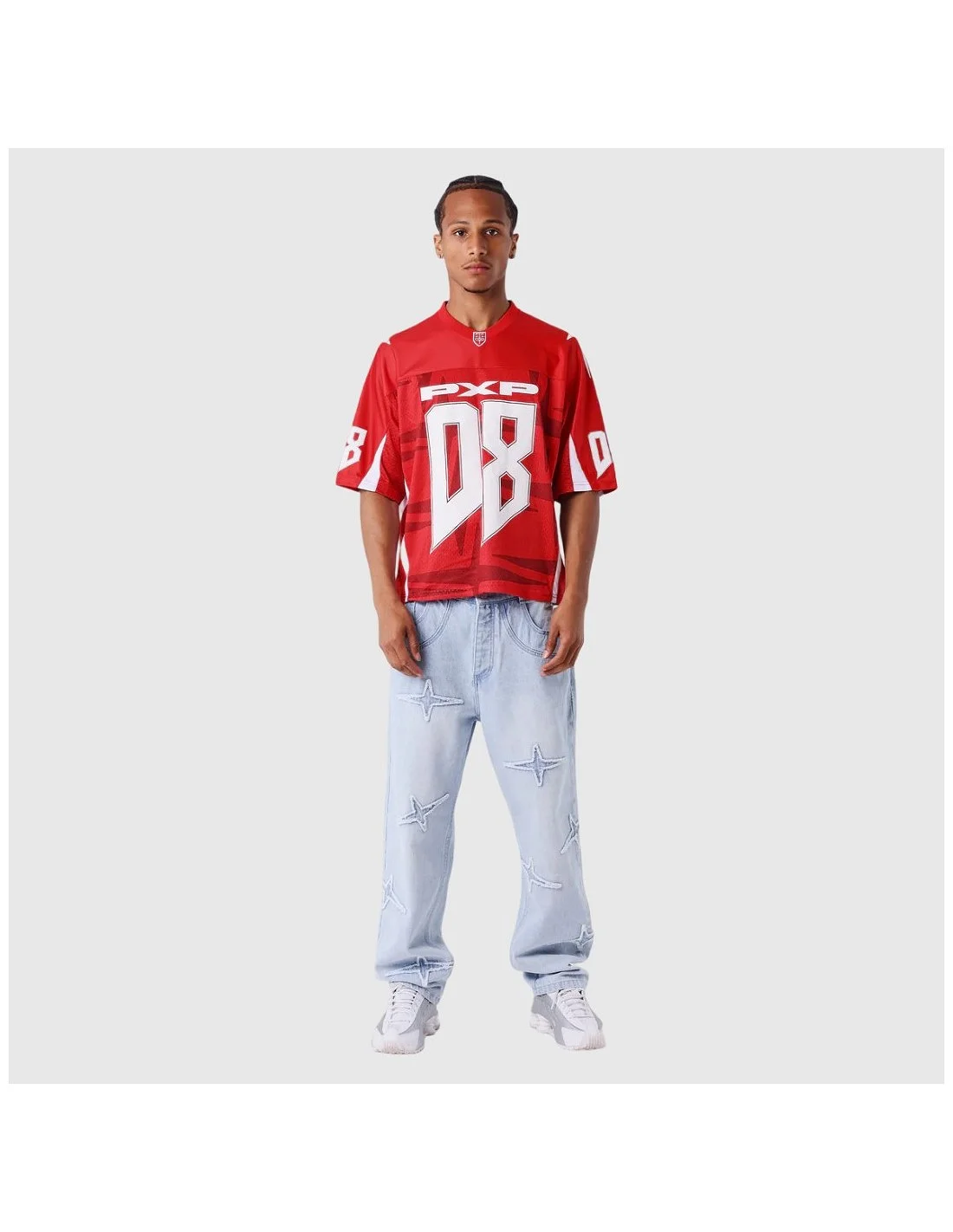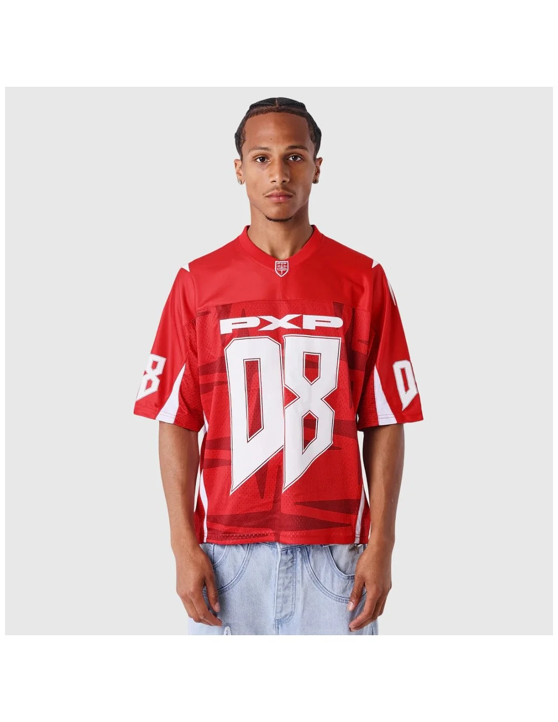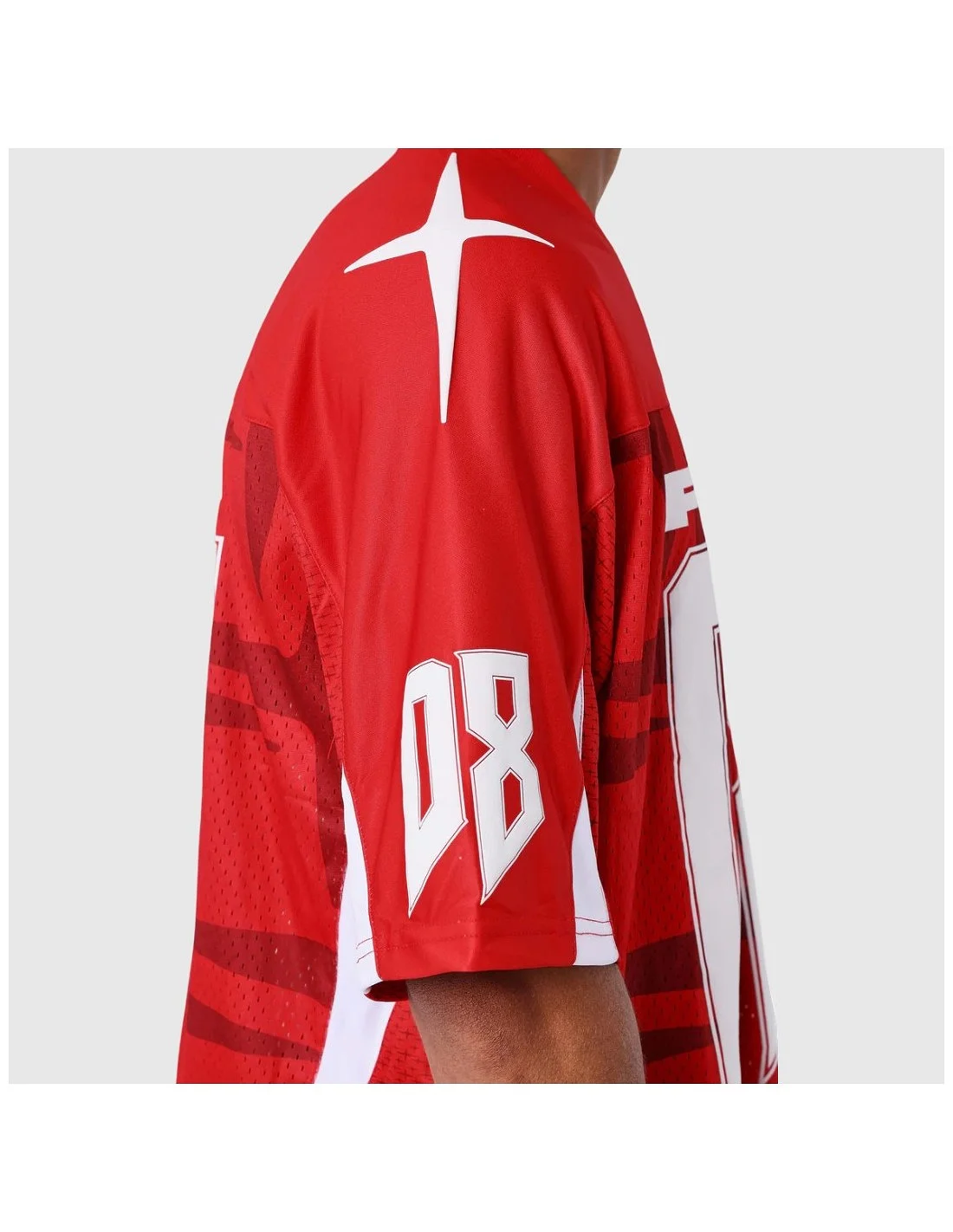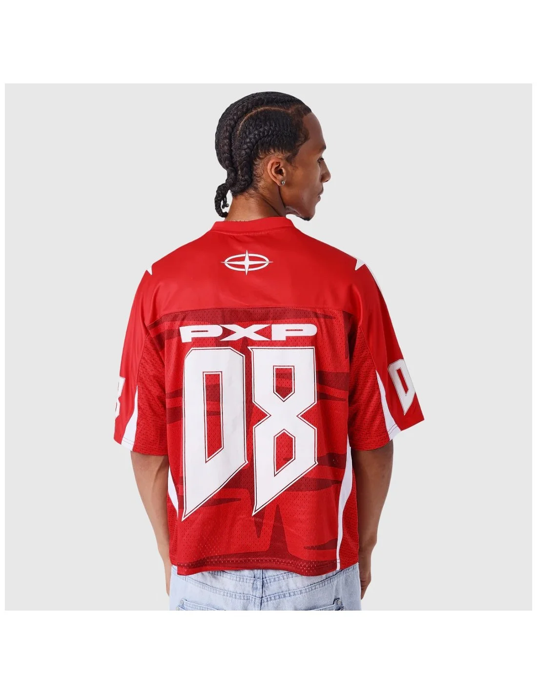 Camiseta de estilo deportivo de Project X Paris con corte holgado y diseño gráfico llamativo. Presenta el número 08 en gran formato tanto en el frente como en la espalda, acompañado del logotipo PXP. Incorpora detalles estampados en las mangas y paneles laterales en tejido de malla que aportan transpirabilidad. Ideal para un look urbano con inspiración deportiva.