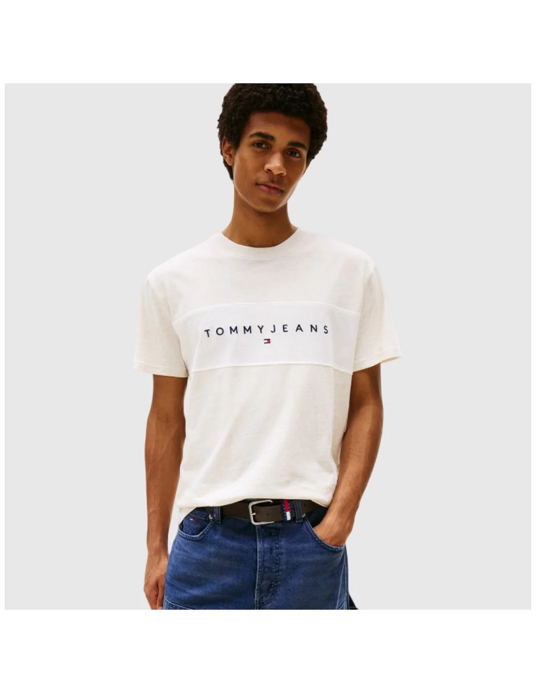 Camiseta Tommy Hilfiger de corte recto con cuello redondo y manga corta. Presenta una banda horizontal en el pecho con el logotipo de la marca bordado en el centro. Confeccionada en algodón suave, ideal para un estilo casual y cómodo.