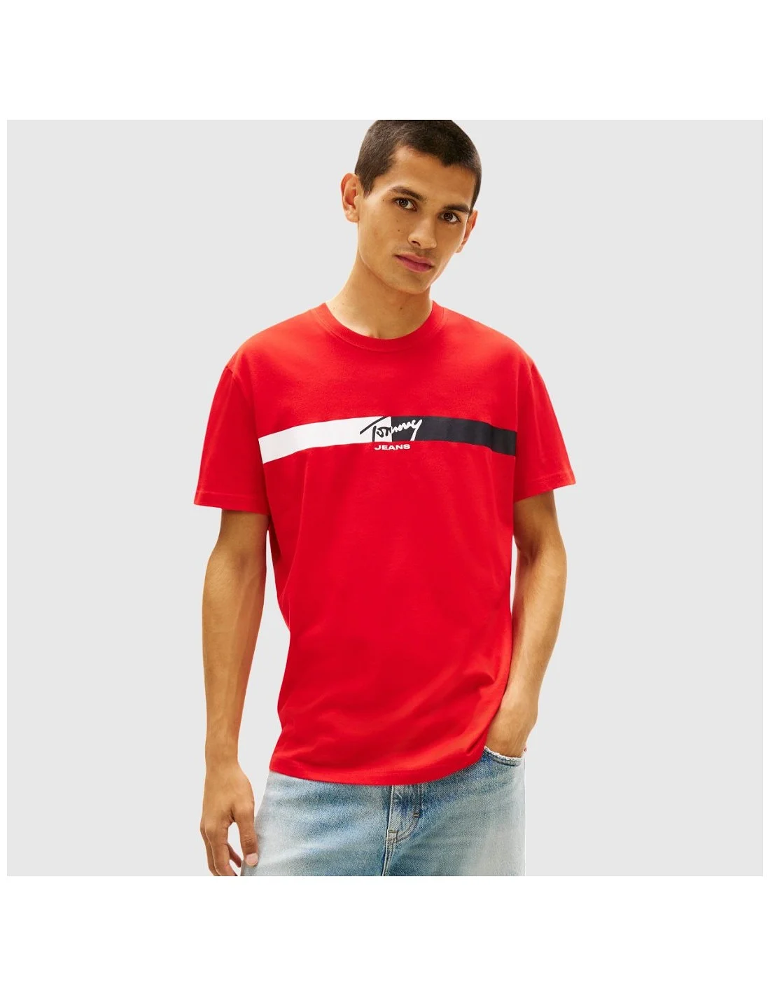 La camiseta Tommy Hilfiger para hombre presenta un diseño con banda frontal y logo, aportando un estilo deportivo y reconocible. Su corte regular y estructura ligera la convierten en una prenda versátil para el uso diario.