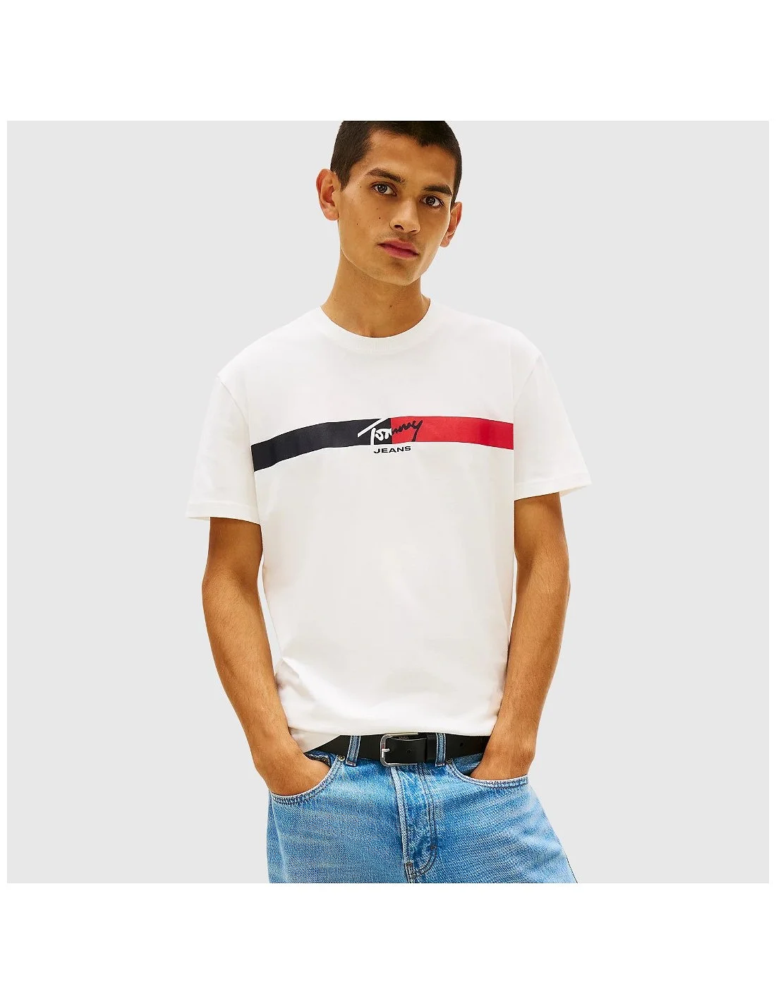 La camiseta Tommy Hilfiger para hombre presenta un diseño con banda frontal y logo, aportando un estilo deportivo y reconocible. Su corte regular y estructura ligera la convierten en una prenda versátil para el uso diario.