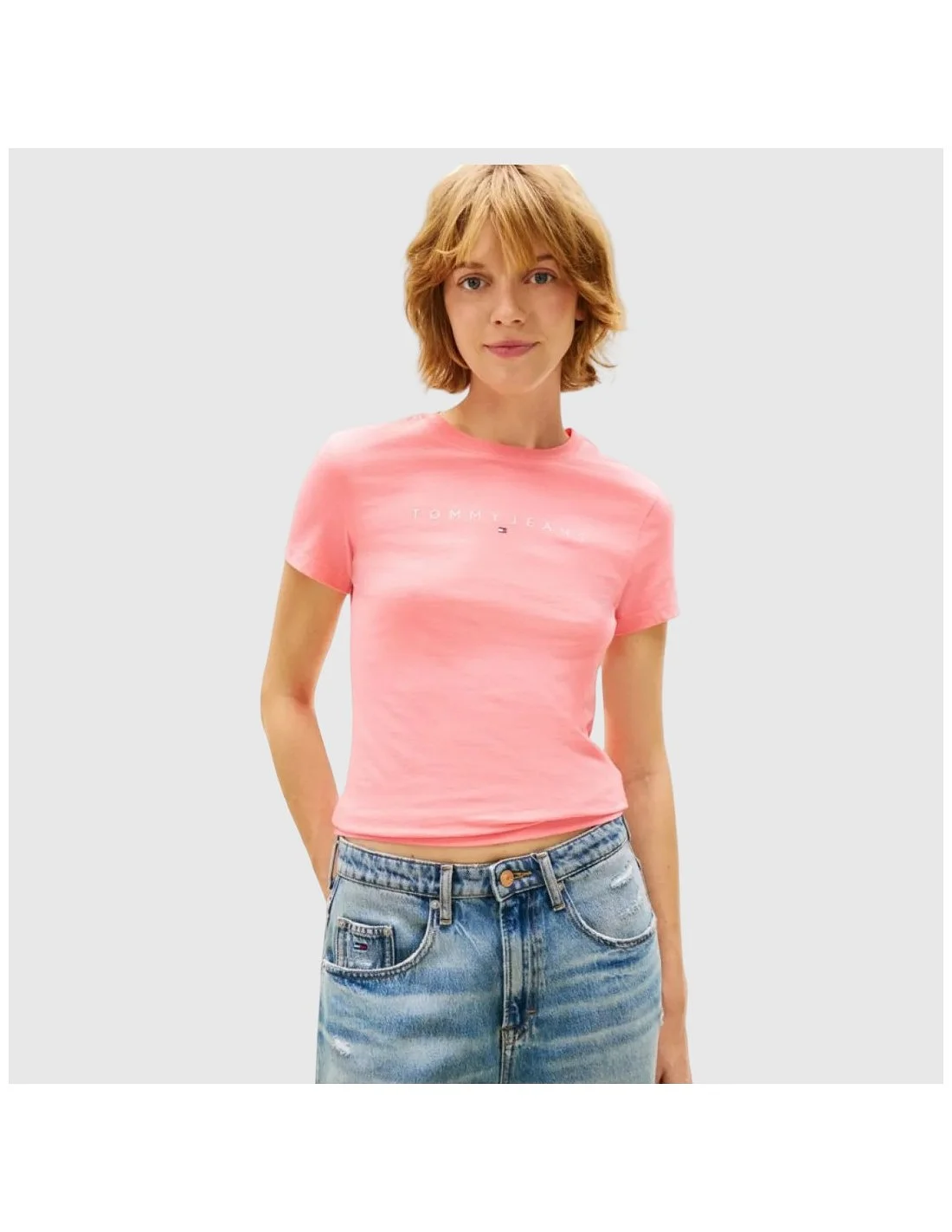 Camiseta Tommy Hilfiger para mujer de estilo casual con diseño minimalista y actual. Presenta cuello redondo y manga corta que aportan comodidad y libertad de movimiento para el uso diario. En la parte frontal incluye el logotipo Tommy Jeans acompañado de la bandera icónica de la marca, aportando un detalle distintivo. Su ajuste entallado ofrece una silueta moderna ideal para combinar con diferentes looks urbanos.