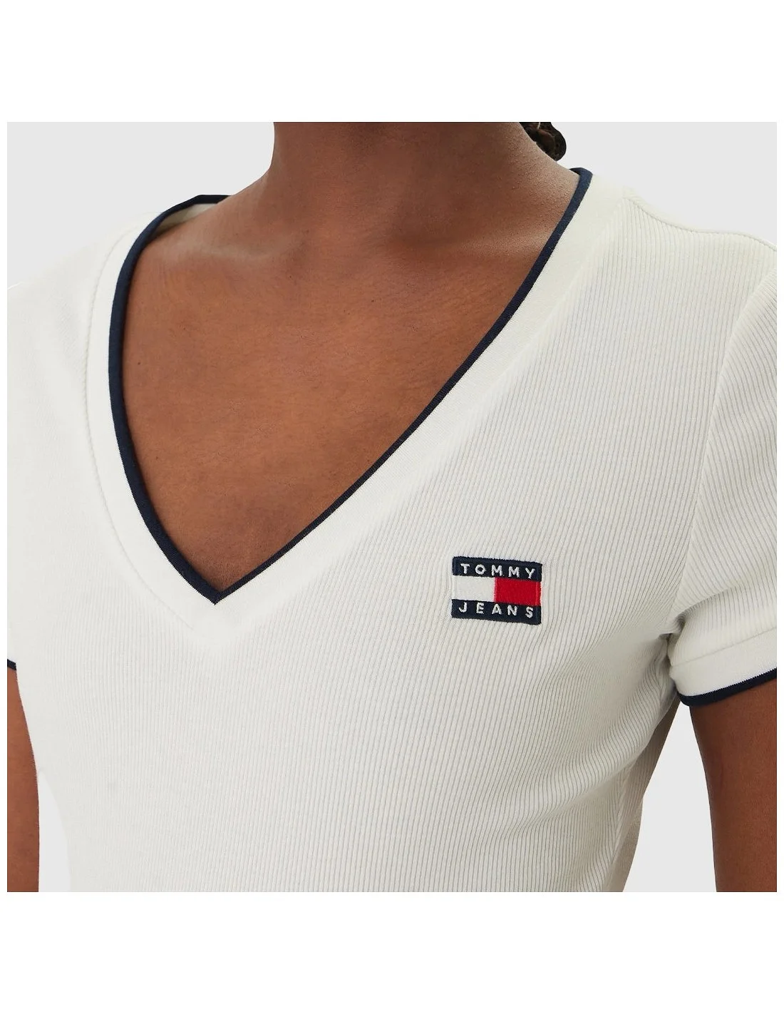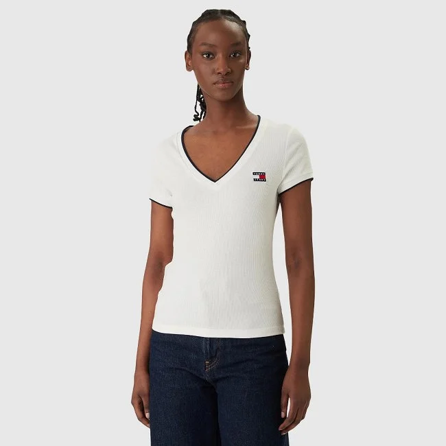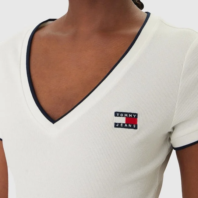 La camiseta Tommy Hilfiger mujer de corte slim fit ofrece un diseño actual con cuello pico que estiliza la silueta. Su ajuste ceñido y tejido elástico proporcionan comodidad y un acabado favorecedor para el uso diario.
