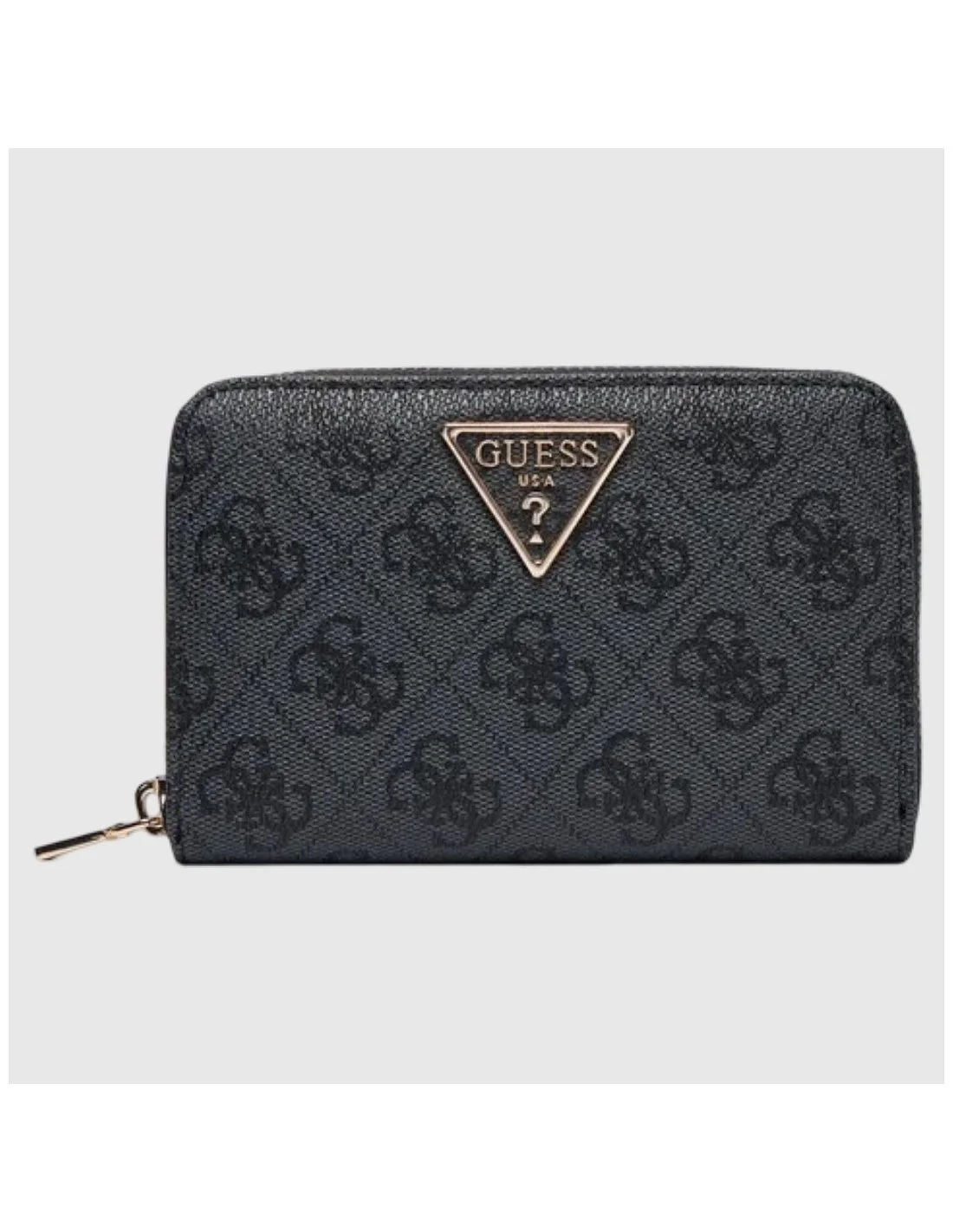 Cartera Guess con diseño monogramado y placa metálica con logo al frente. Incluye compartimentos para tarjetas, billetes y monedero con cierre. Estilo compacto y funcional.