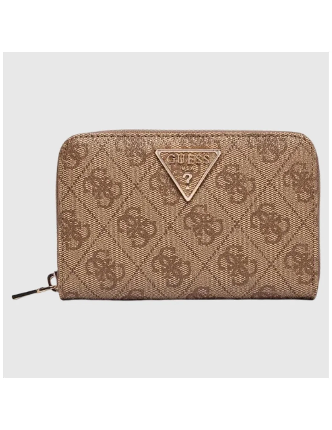 Cartera Guess con diseño monogramado y placa metálica con logo al frente. Incluye compartimentos para tarjetas, billetes y monedero con cierre. Estilo compacto y funcional.