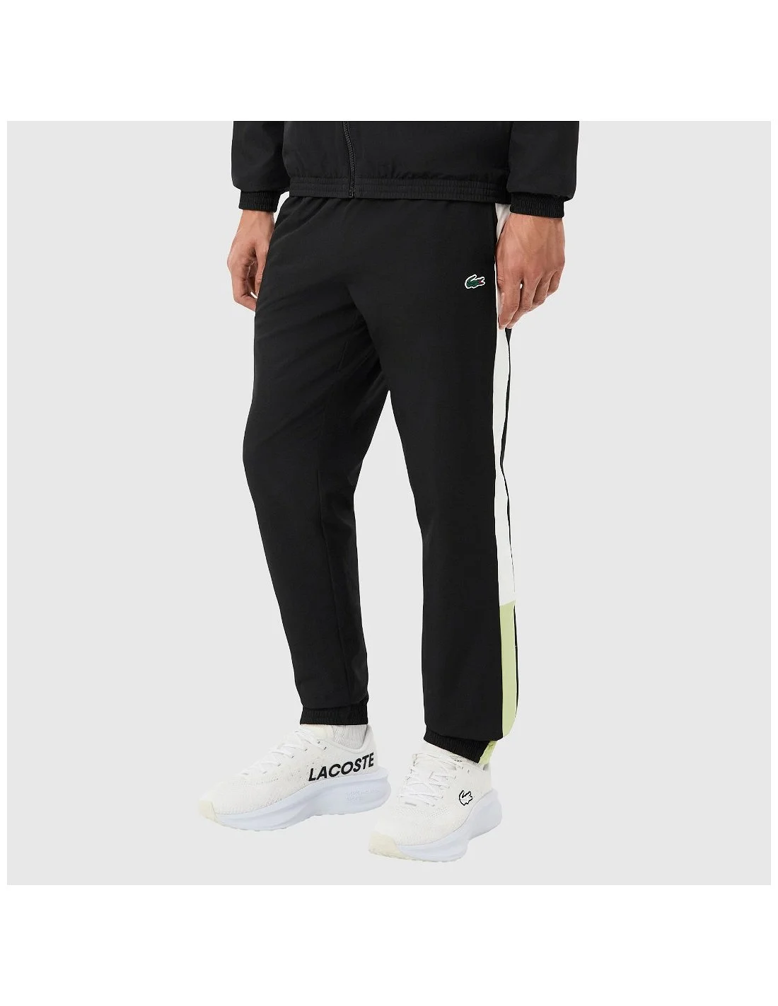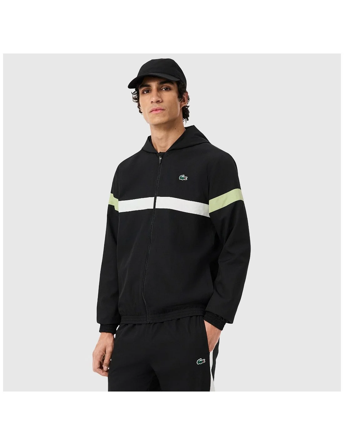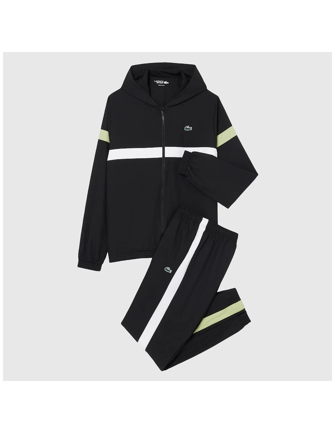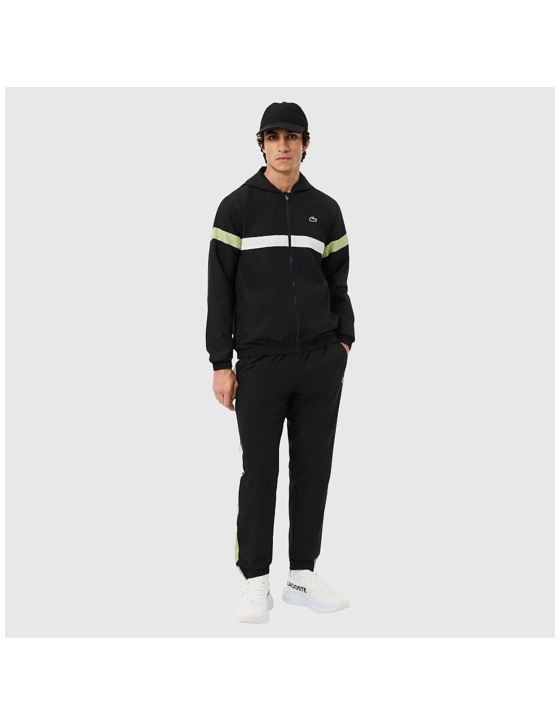 Chándal LACOSTE compuesto por chaqueta con capucha y pantalón largo a juego. La chaqueta presenta cremallera completa, bolsillos laterales y un diseño con franjas contrastantes en el pecho y mangas. El pantalón incluye cintura elástica con cordón ajustable, bolsillos laterales y franjas decorativas en los laterales. Ambas piezas incorporan el icónico logo del cocodrilo bordado, combinando estilo y comodidad para un look deportivo y urbano.