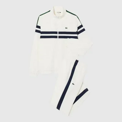 El chándal de Lacoste ofrece funcionalidad y estilo para tus entrenamientos o momentos de relax. Confeccionado en tafetán liviano, incluye chaqueta con cremallera completa, cuello alto y franjas en contraste en las mangas. El pantalón presenta cintura elástica, bolsillos laterales y ajuste recto. Destaca el logotipo en el pecho y un cocodrilo gráfico en la espalda. Ideal para uso deportivo.