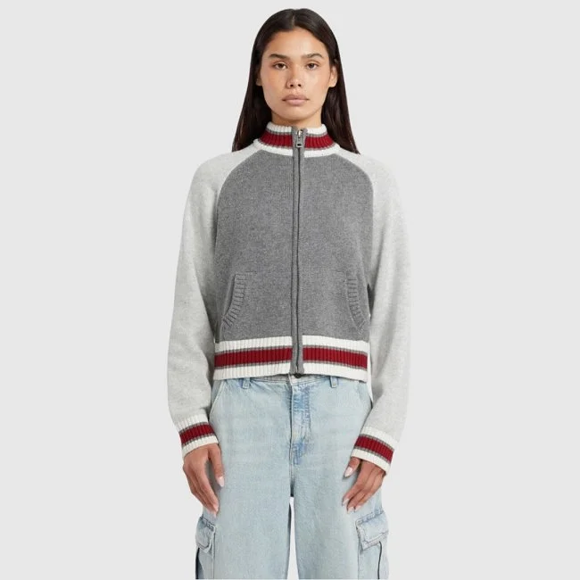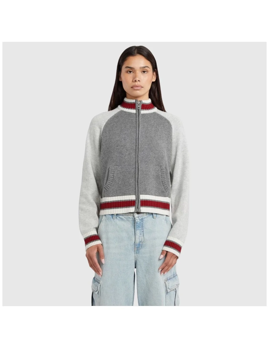 Chaqueta de punto Guess Jeans con cierre de cremallera completa en la parte frontal y cuello alto acanalado. Presenta un diseño bicolor con mangas raglán y bolsillos laterales de estilo funcional. Los ribetes acanalados en cuello, puños y bajo incorporan franjas a contraste que aportan un aire deportivo. En la espalda destaca un gran motivo gráfico con estrella, inicial y nombre de la marca, reforzando su estética retro universitaria.