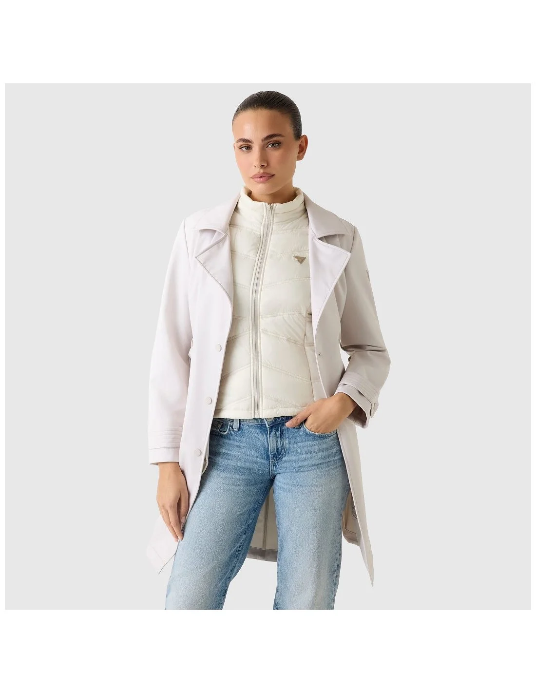Esta chaqueta de Guess presenta un diseño sofisticado y funcional ideal para el entretiempo. De corte recto y largo medio, destaca por su confección estructurada con solapas amplias, cierre frontal con botones a presión y detalles de costuras marcadas que estilizan la silueta. Incluye cinturón trasero decorativo con trabillas, mangas largas con ajuste en los puños y el distintivo logotipo metálico de la marca en la manga. Un modelo versátil que combina elegancia y comodidad para un look urbano refinado.